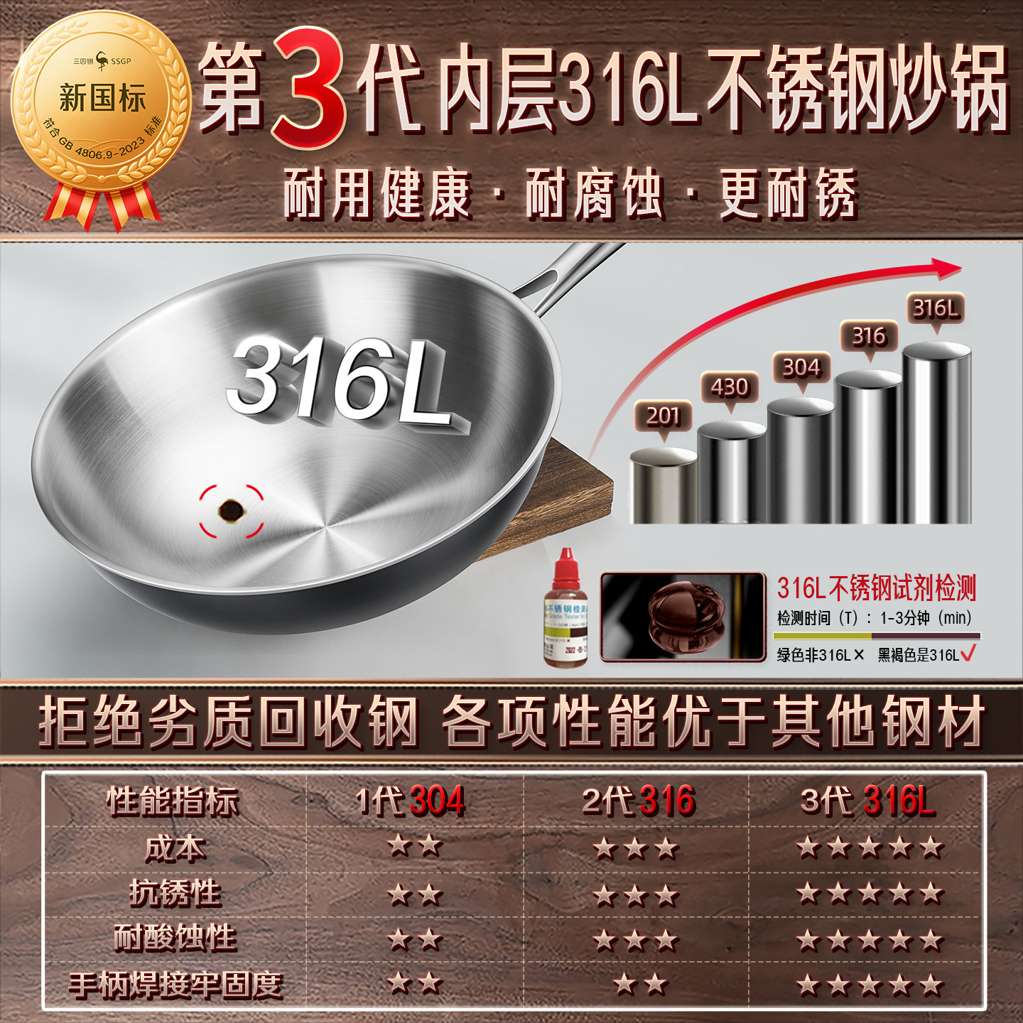 三四钢®不锈钢0涂层炒锅家用内层316L食品级圆底炒菜锅官方正品