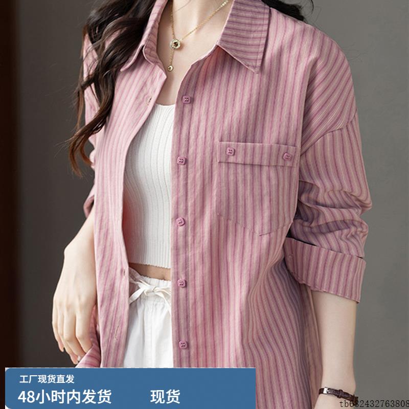广东普宁粉色条纹衬衫外套女早秋新款大码洋气气质上衣衬衣上档次