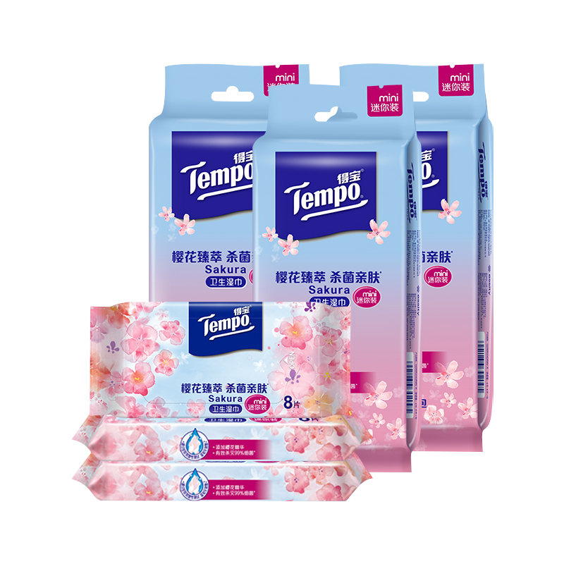 Tempo得宝擦手清洁便携迷你樱花湿巾8片6小包/12小包/18小包任选