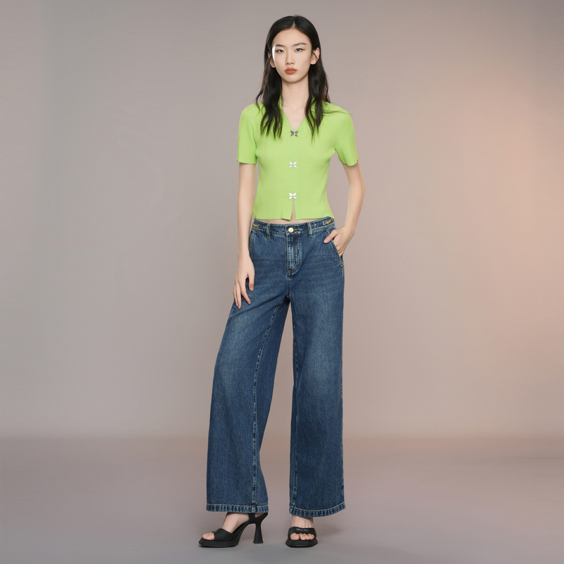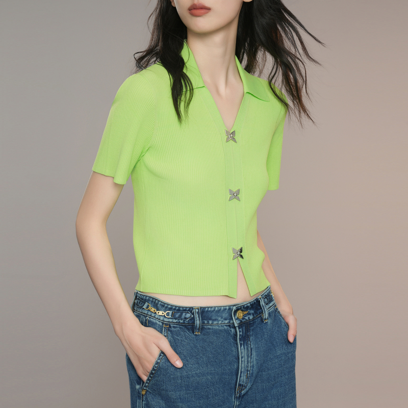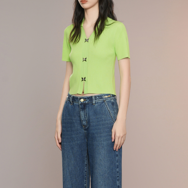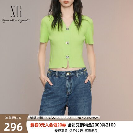 XG雪歌个性蝴蝶扣V领短袖针织衫女25夏新款套头上衣XK211023A142