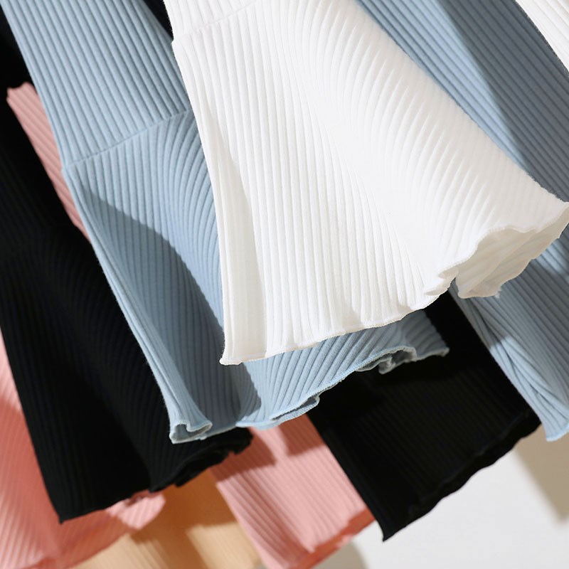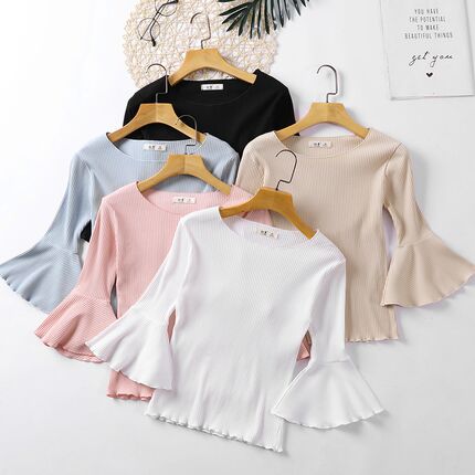 早春短款针织T恤女上衣黑色紧身七分袖喇叭袖百搭白色内搭打底衫