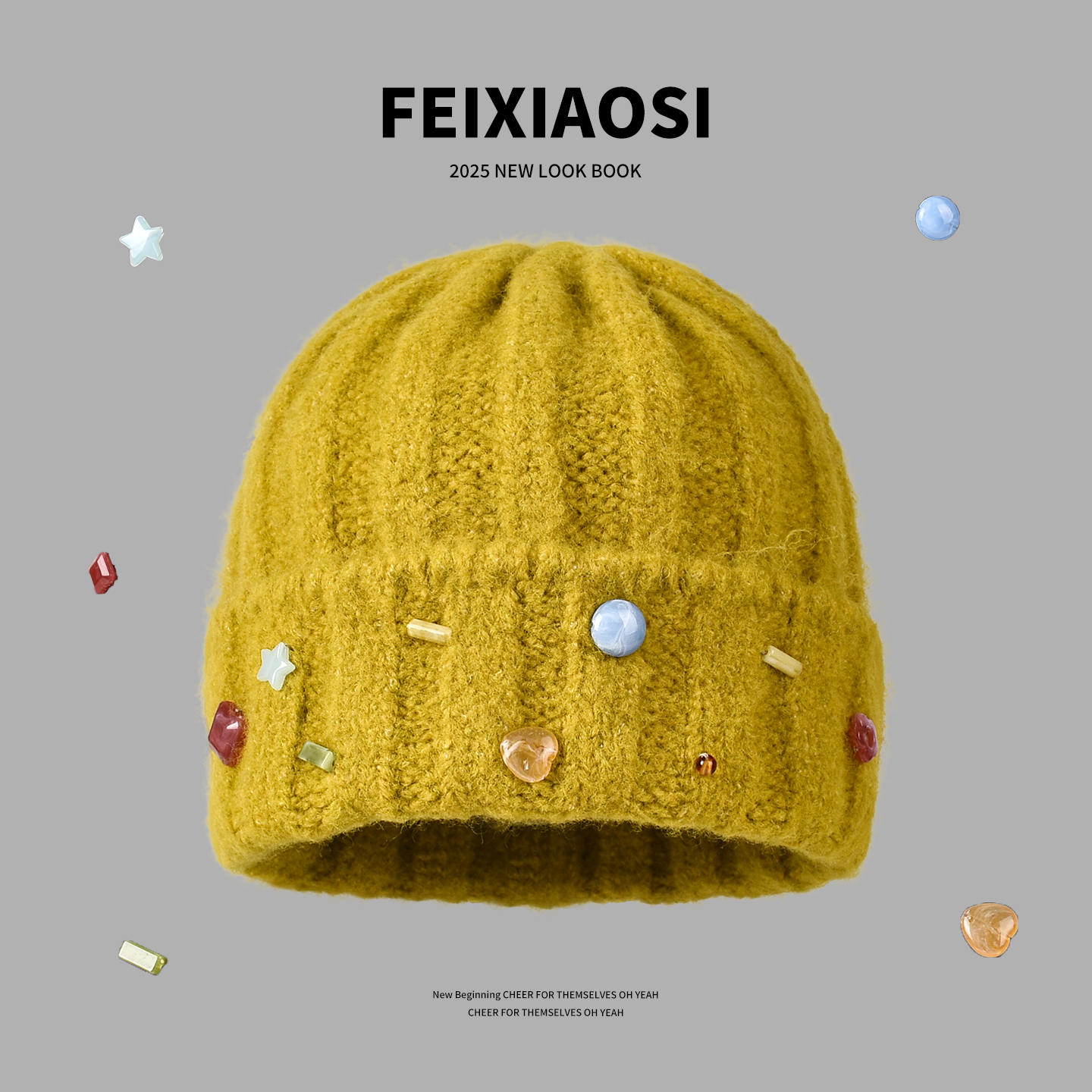 网红韩系彩色宝石针织帽女秋冬保暖护耳羊毛毛线帽百搭冷帽时尚潮