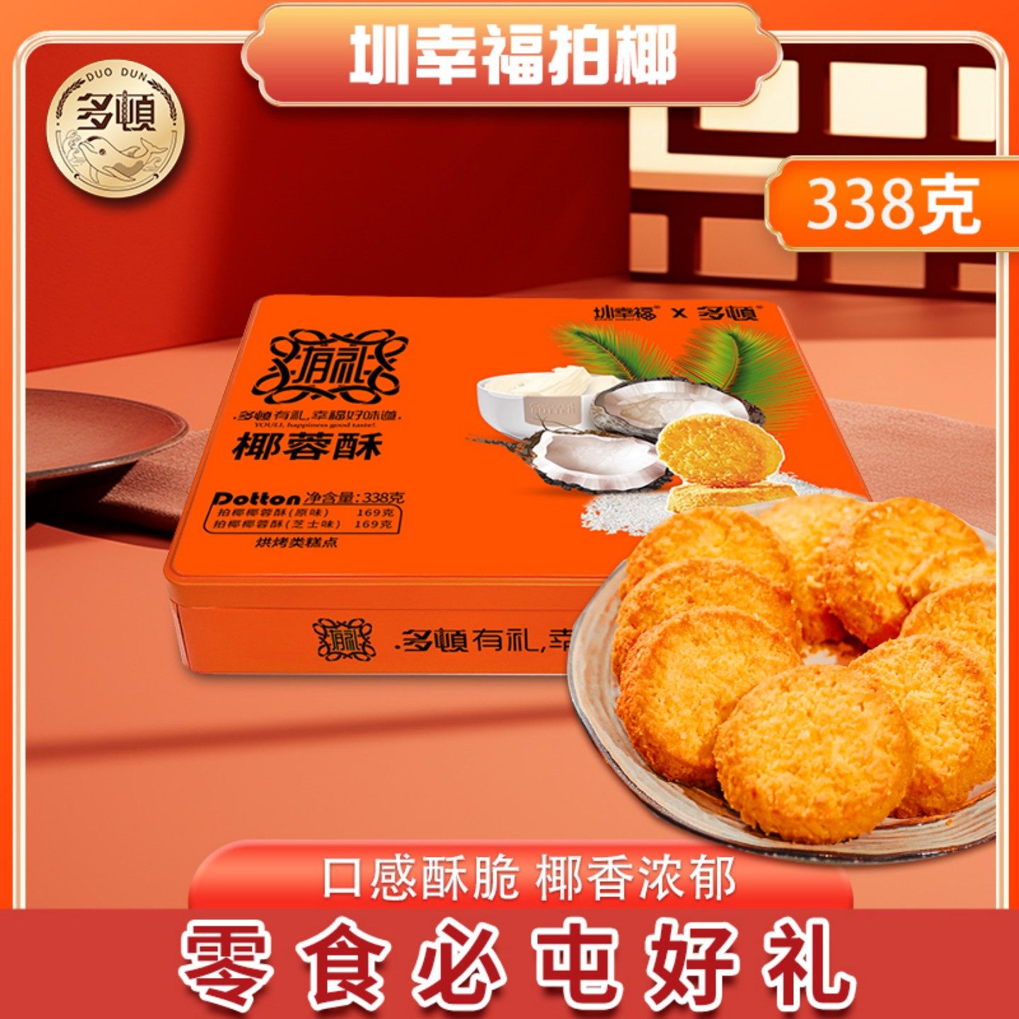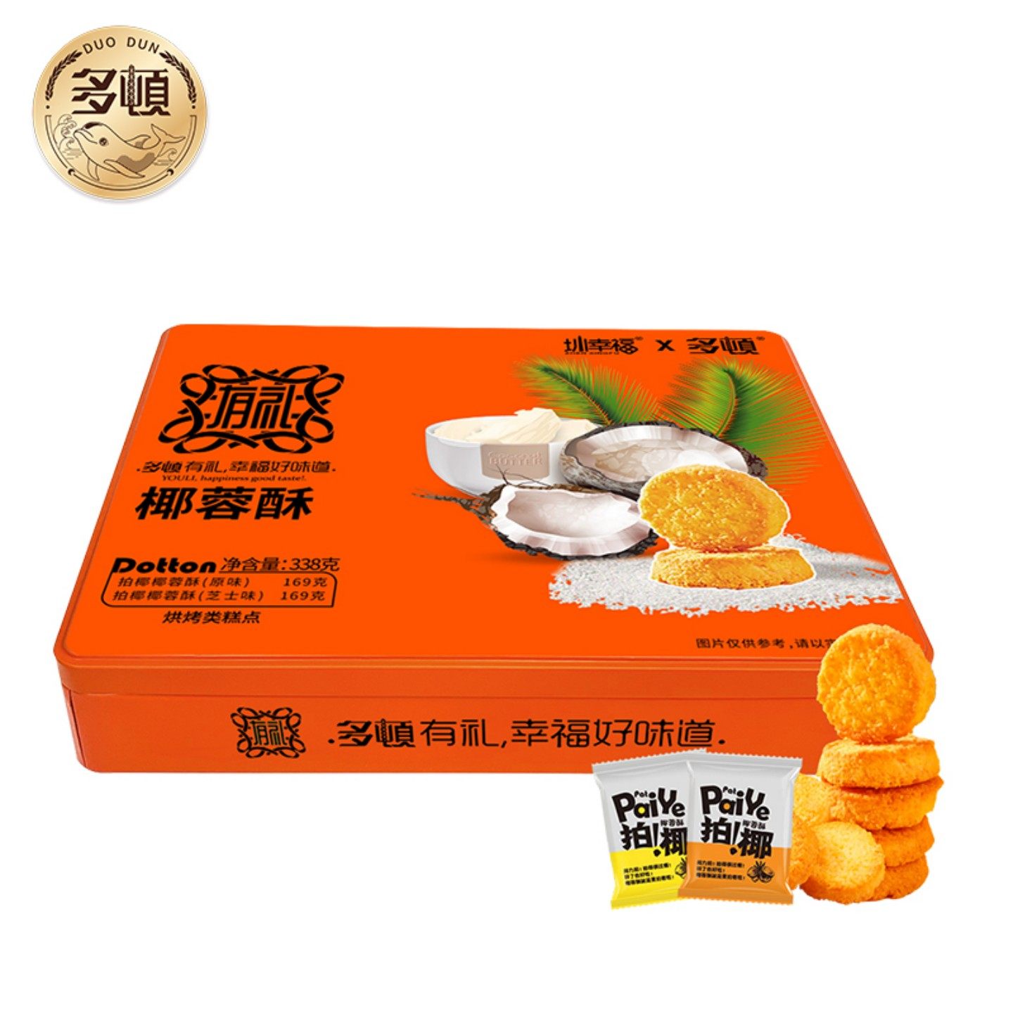 多顿黄油椰子酥拍椰椰蓉酥曲奇饼干独立小包装零食小吃铁盒装礼品