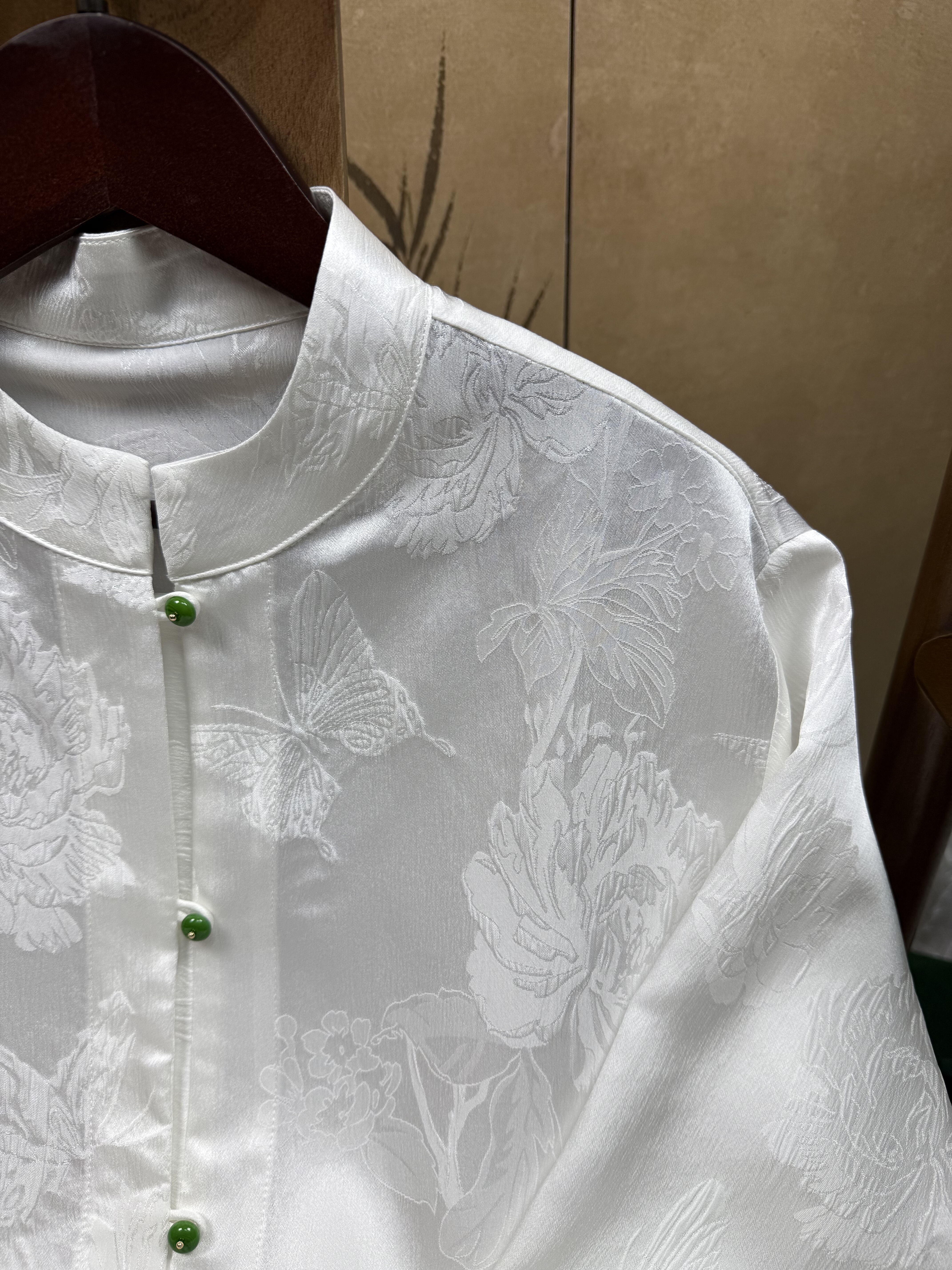 100%桑蚕丝提花气质立领30姆米冠乐缎衬衫新中式国风气质白色衬衫