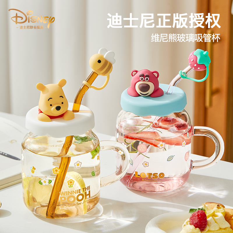 迪士尼维尼熊玻璃吸管杯高颜值大容量水杯家用杯子果汁冷泡冷饮杯
