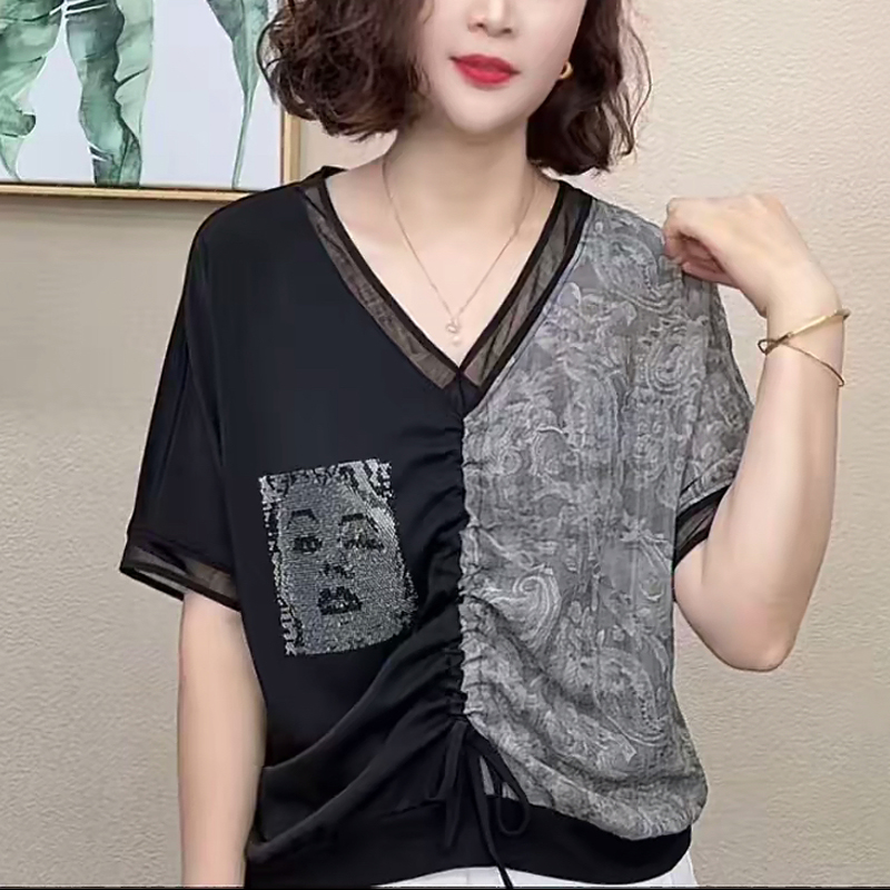 妈妈装夏季V领拼接美女烫钻前抽绳短袖蝙蝠衫时尚女T恤减龄女上衣