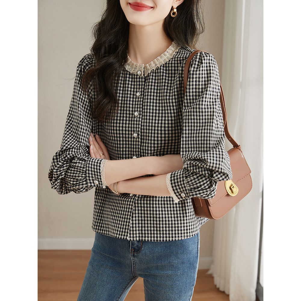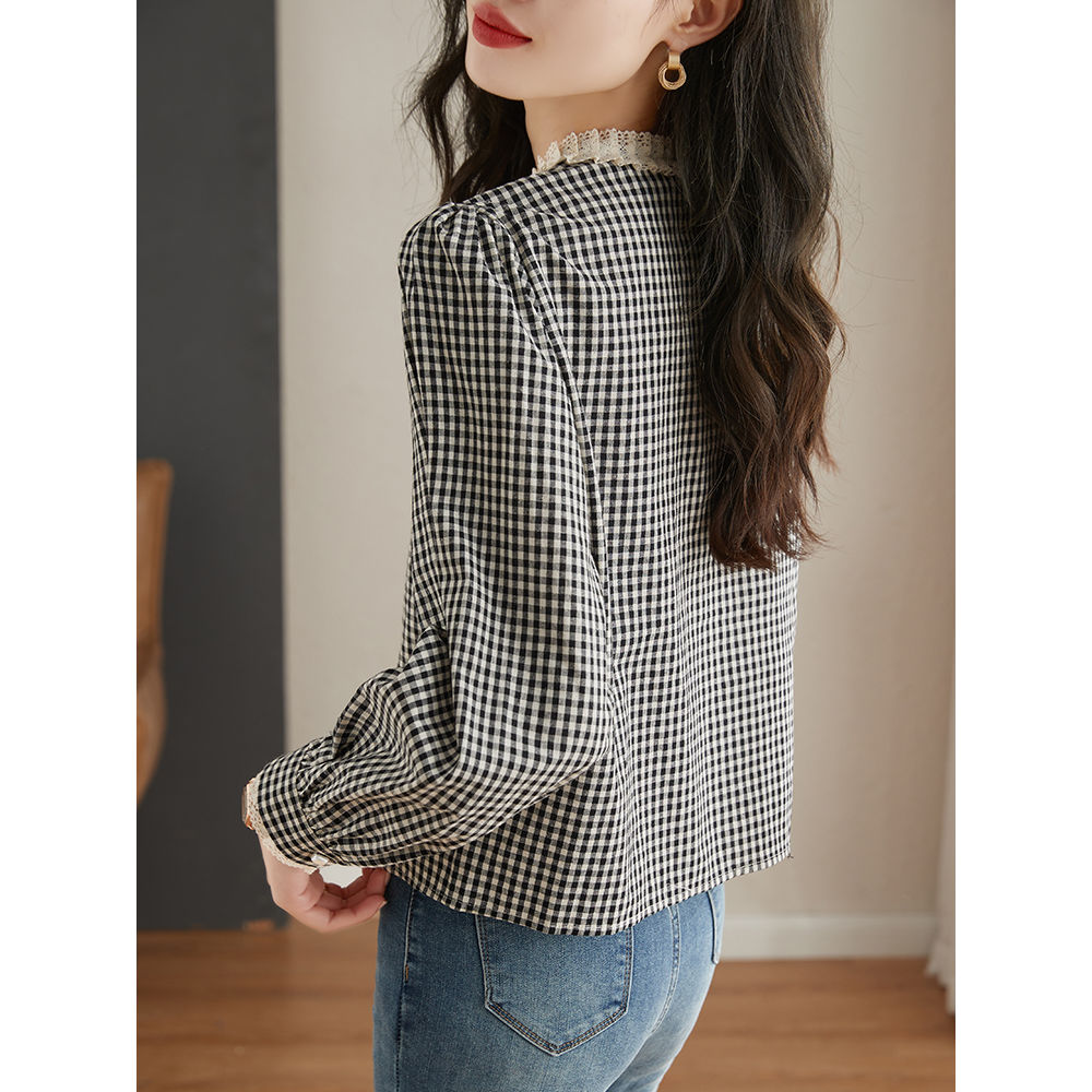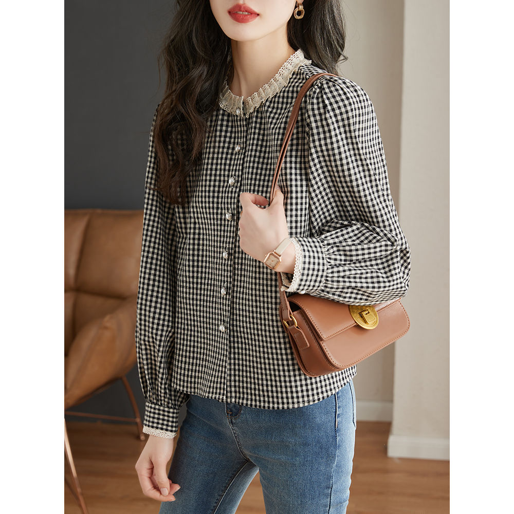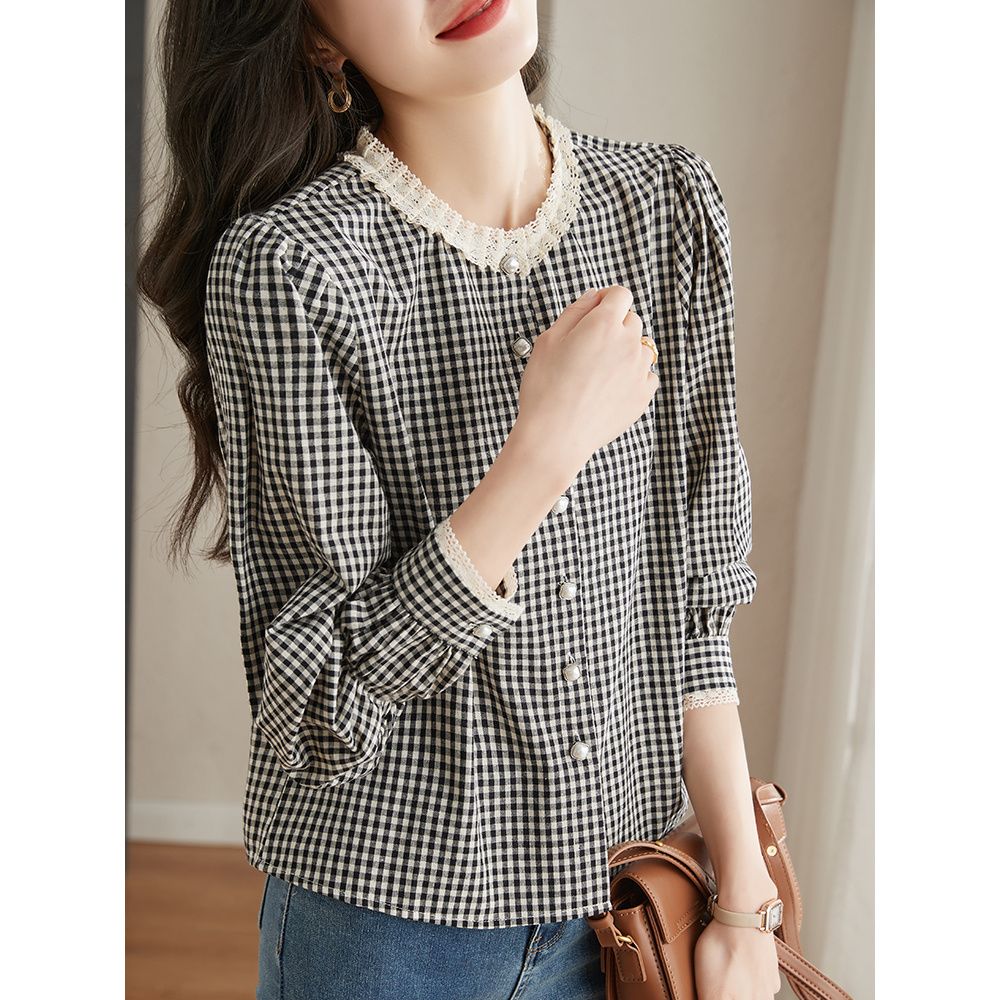 2025春夏季新款法式复古圆领蕾丝格子衬衫女气质长袖上衣