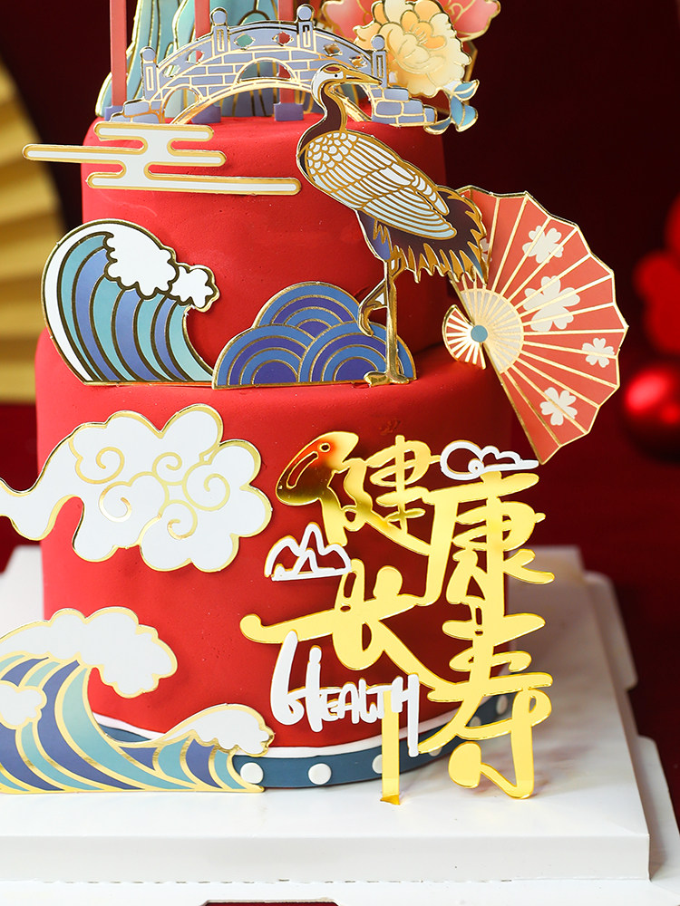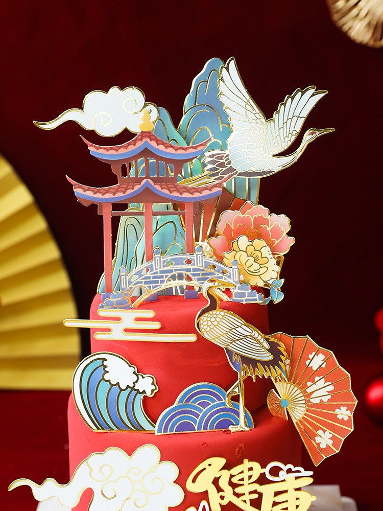 新年蛋糕装饰国潮风中式烫金仙鹤扇子祝寿插牌古风祥云波浪亭插件