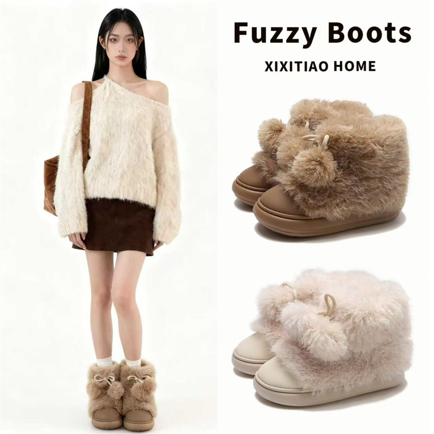 时尚女士防滑毛毛雪地靴外穿保暖加绒少女心可爱毛球冬季东北棉鞋