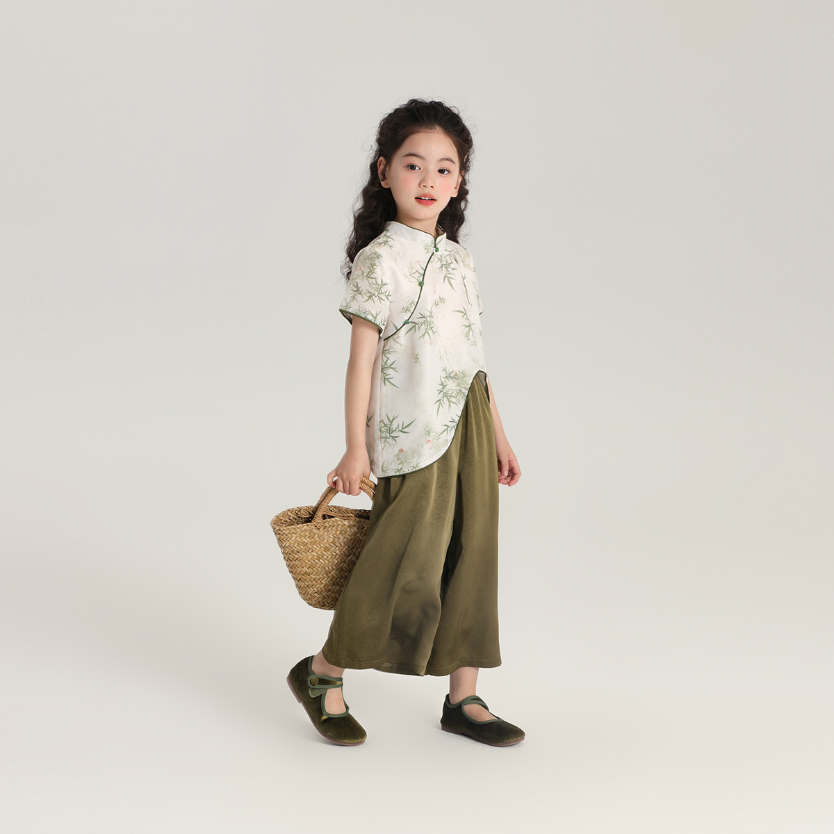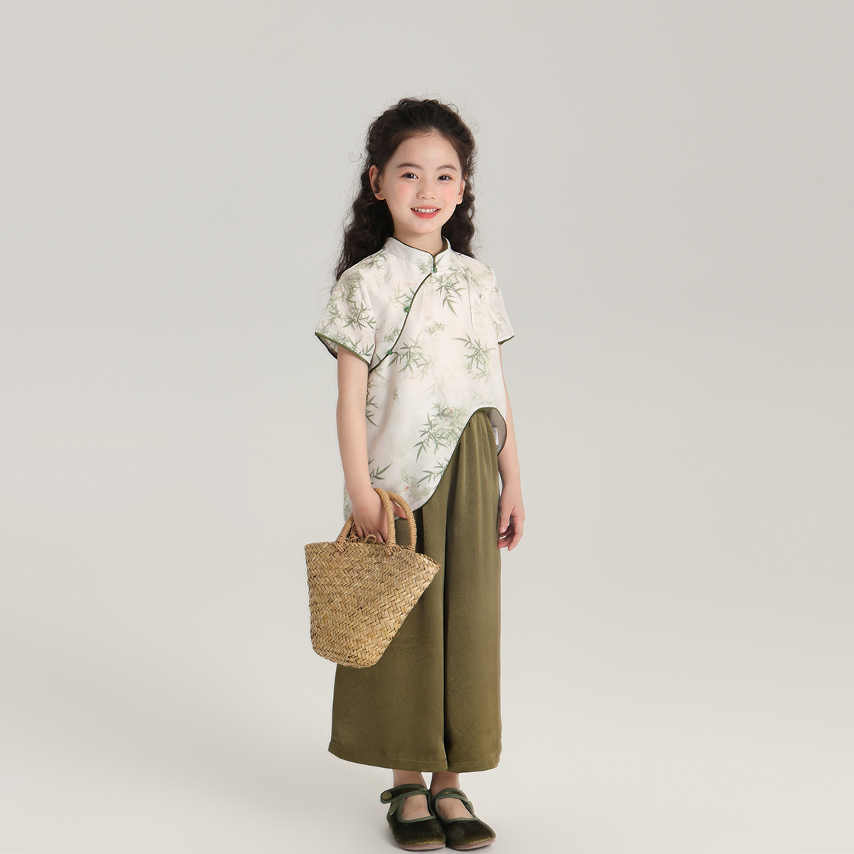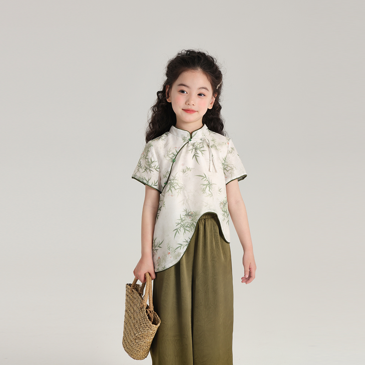 布丁哈鲁童装新中式女童国风套装儿童夏季2025新款长裤唐装短袖