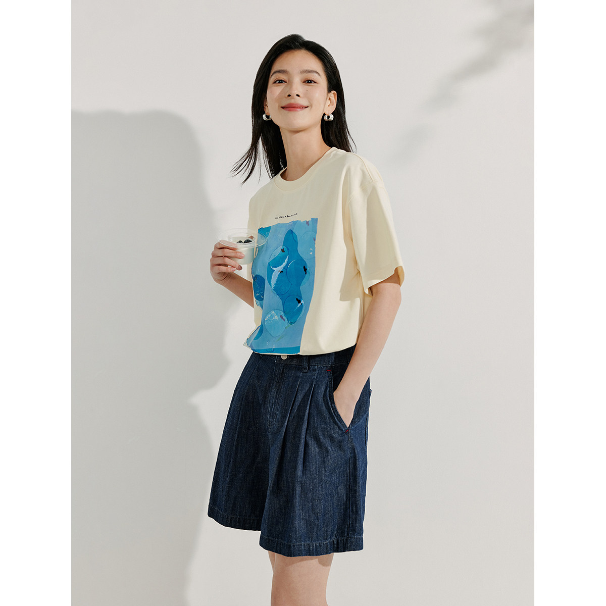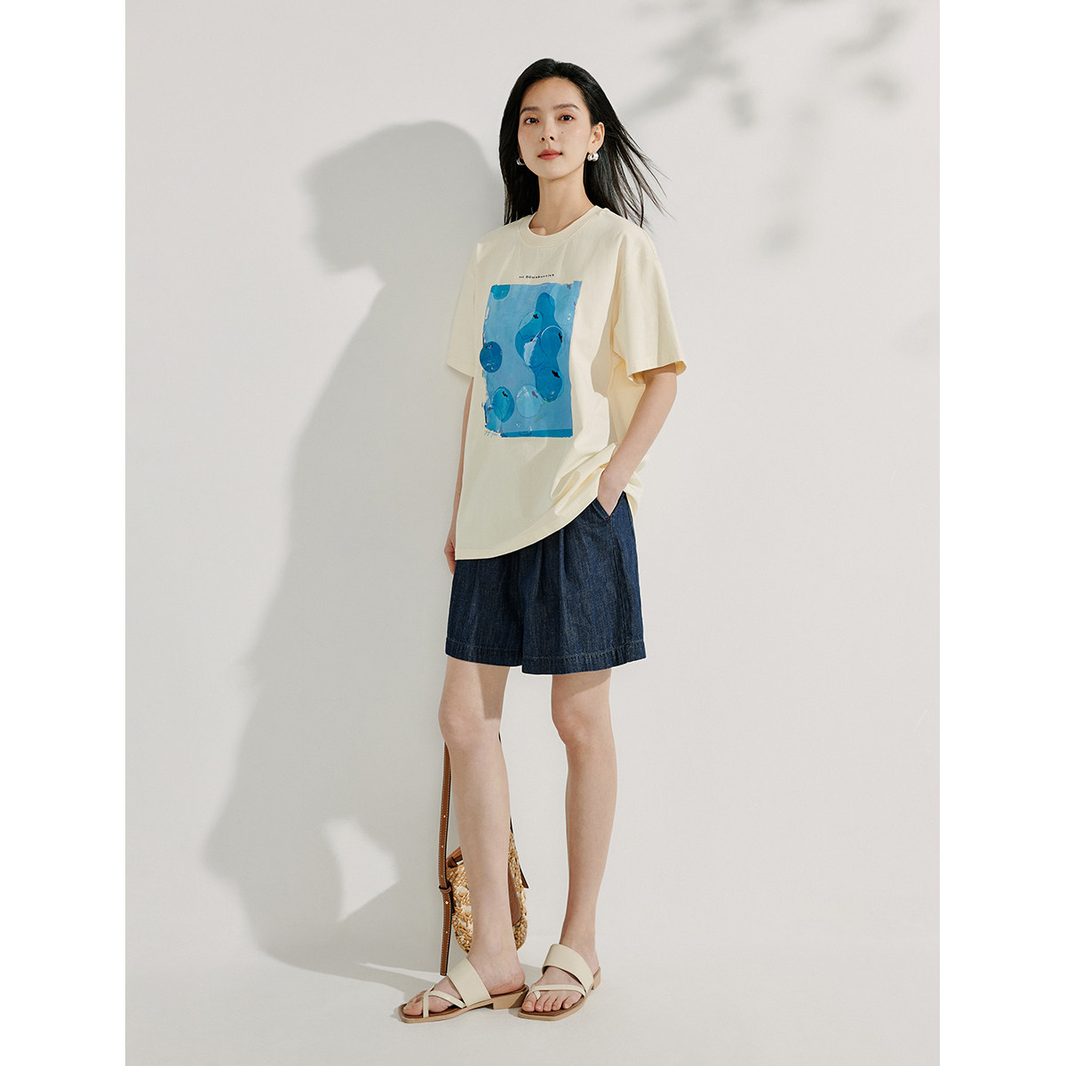 茵曼纯棉印花休闲T恤2025夏季女装新款简约百搭宽松圆领短袖上衣