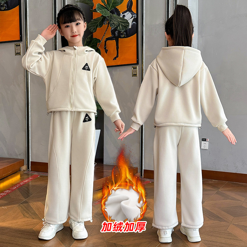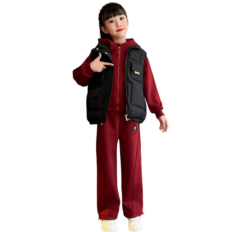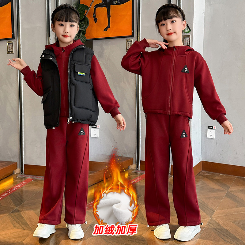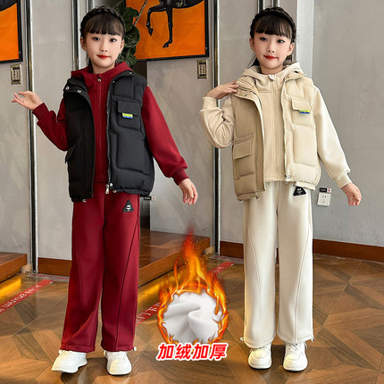 女童秋冬加绒卫衣外套运动套装洋气中大童羽绒棉马甲加厚三件套潮