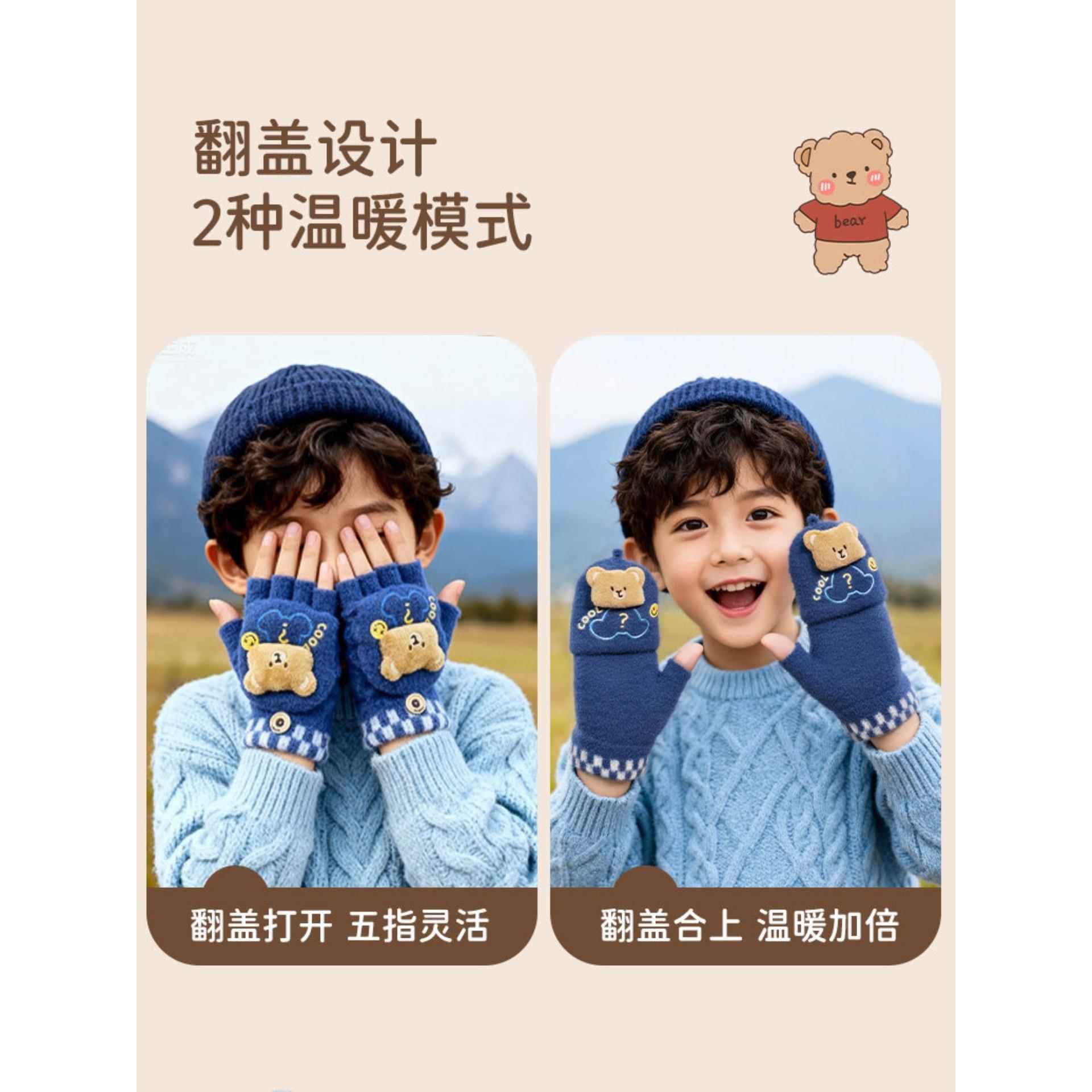 儿童手套冬季女童宝宝可爱保暖加厚五指翻盖写字男童小学生半指女
