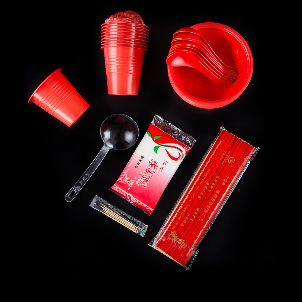 一次性碗筷套装酒席家用环保加厚杯碟勺子结婚喜宴红色塑料餐具碗