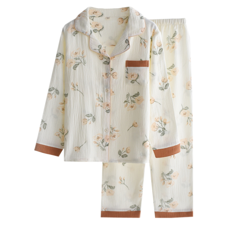 印花茶花睡衣女士春秋夏季纯棉纱布薄款宽松长袖开衫家居服套装