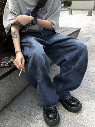 Aurocean 脏帅深蓝牛仔裤 水洗做旧脏染磨损宽松大版收褶长裤