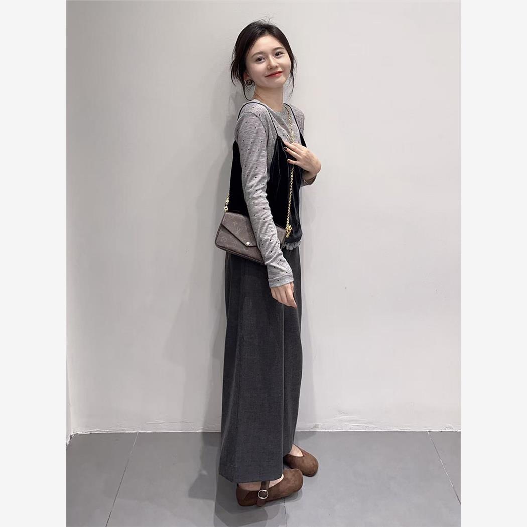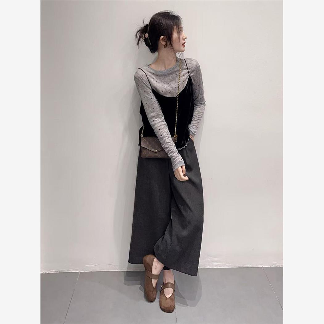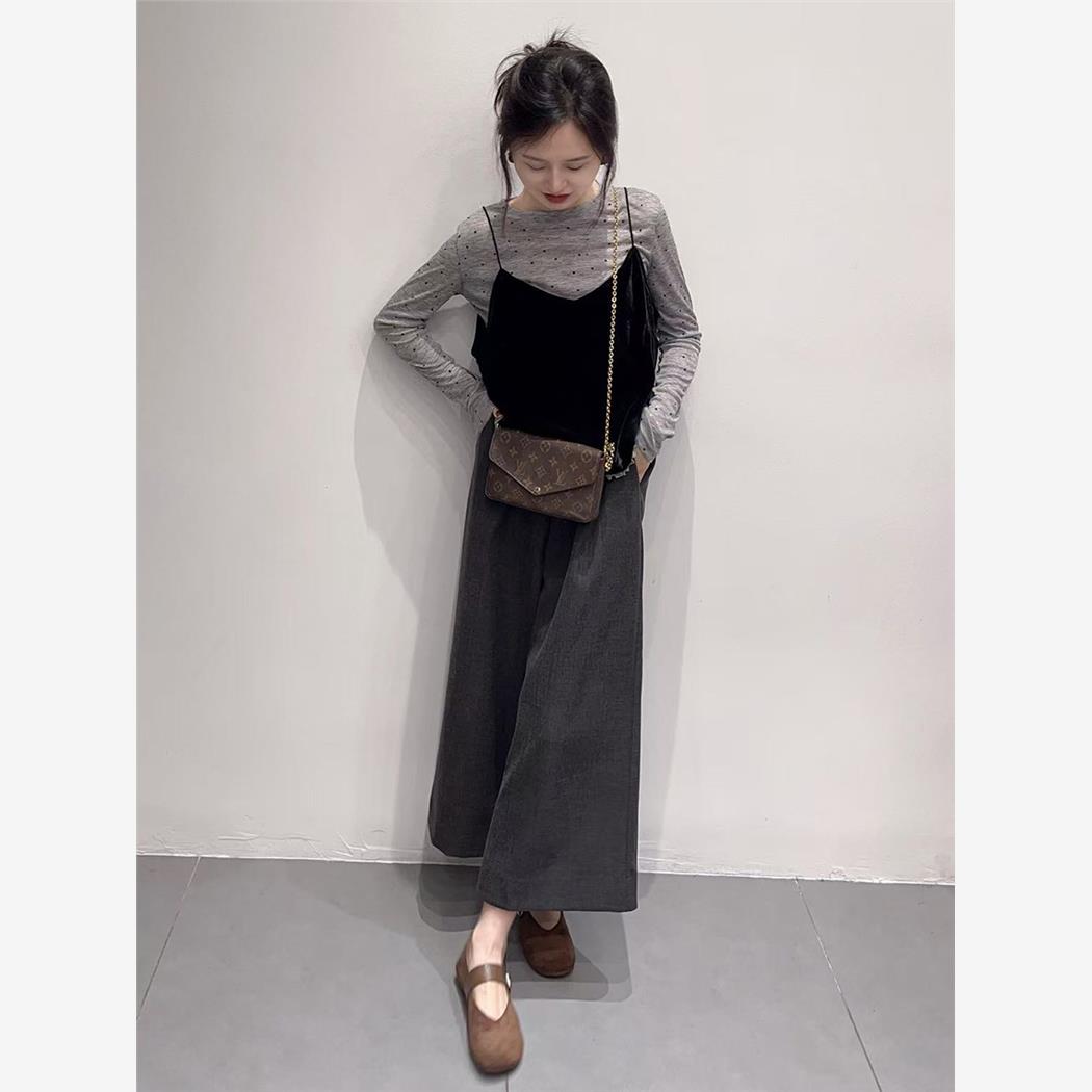 2025秋季法式波点长袖打底T恤丝绒吊带衫外穿上衣休闲长裤套装女