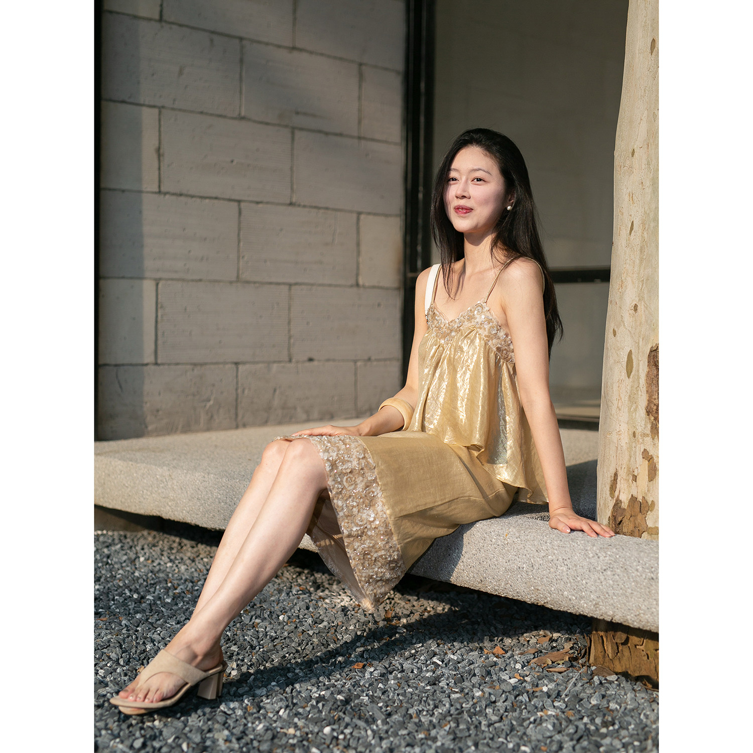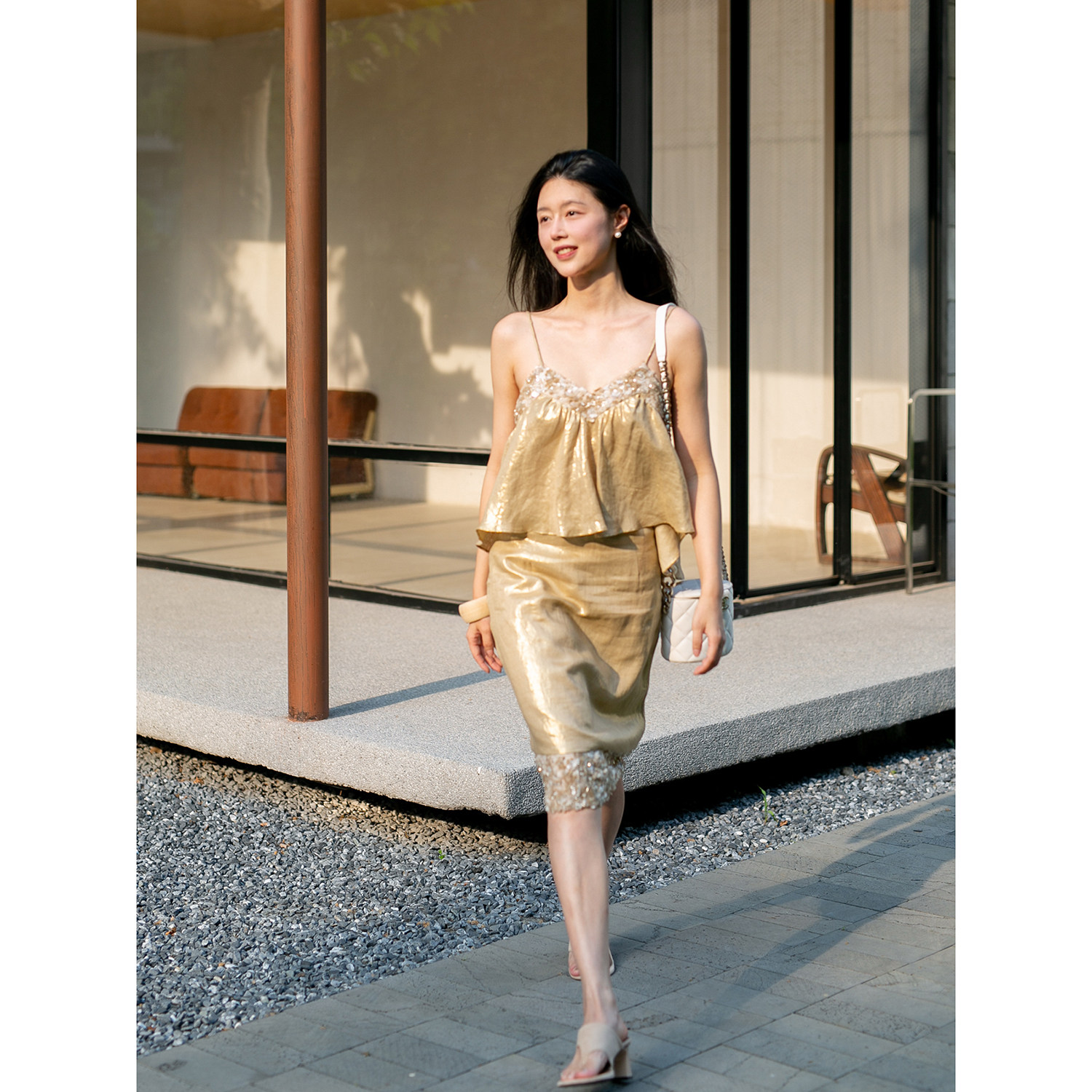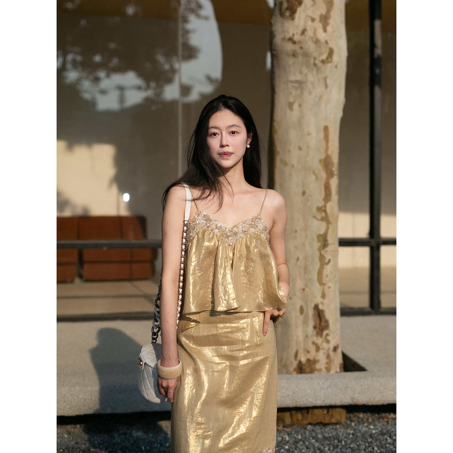 Floating缤纷乐园任你行 鎏金亚麻拼钉珠吊带+半身裙气质优雅套装