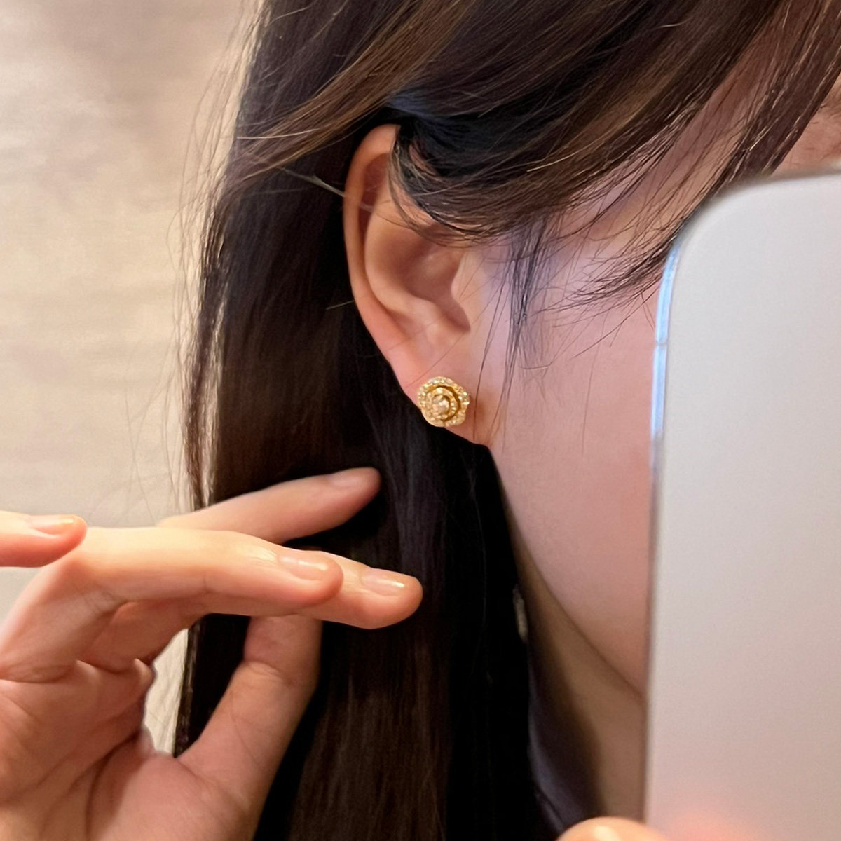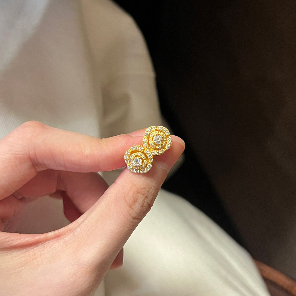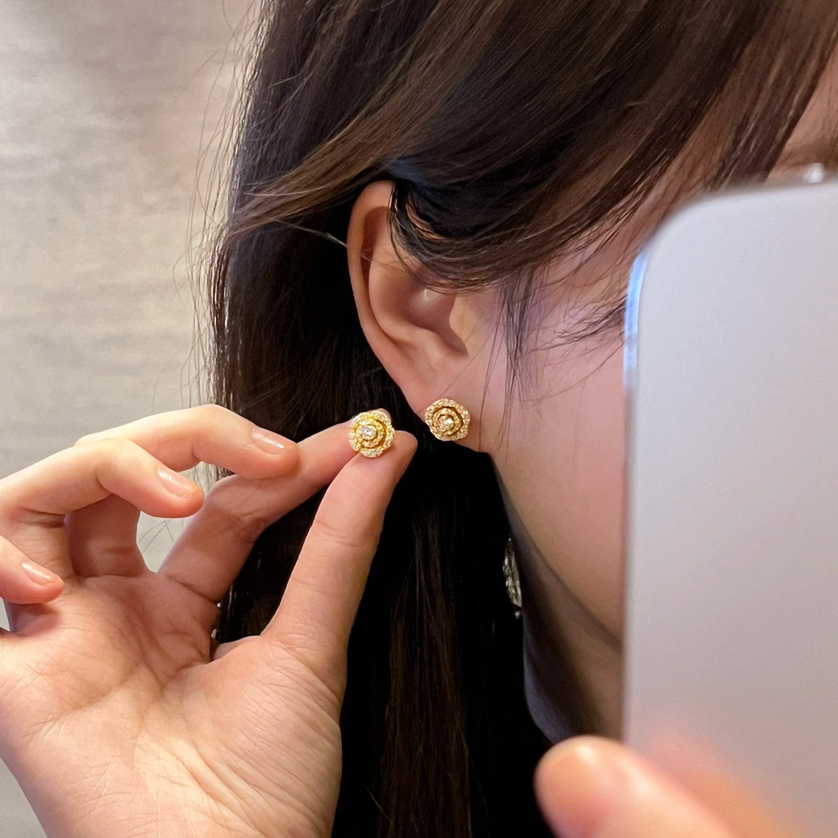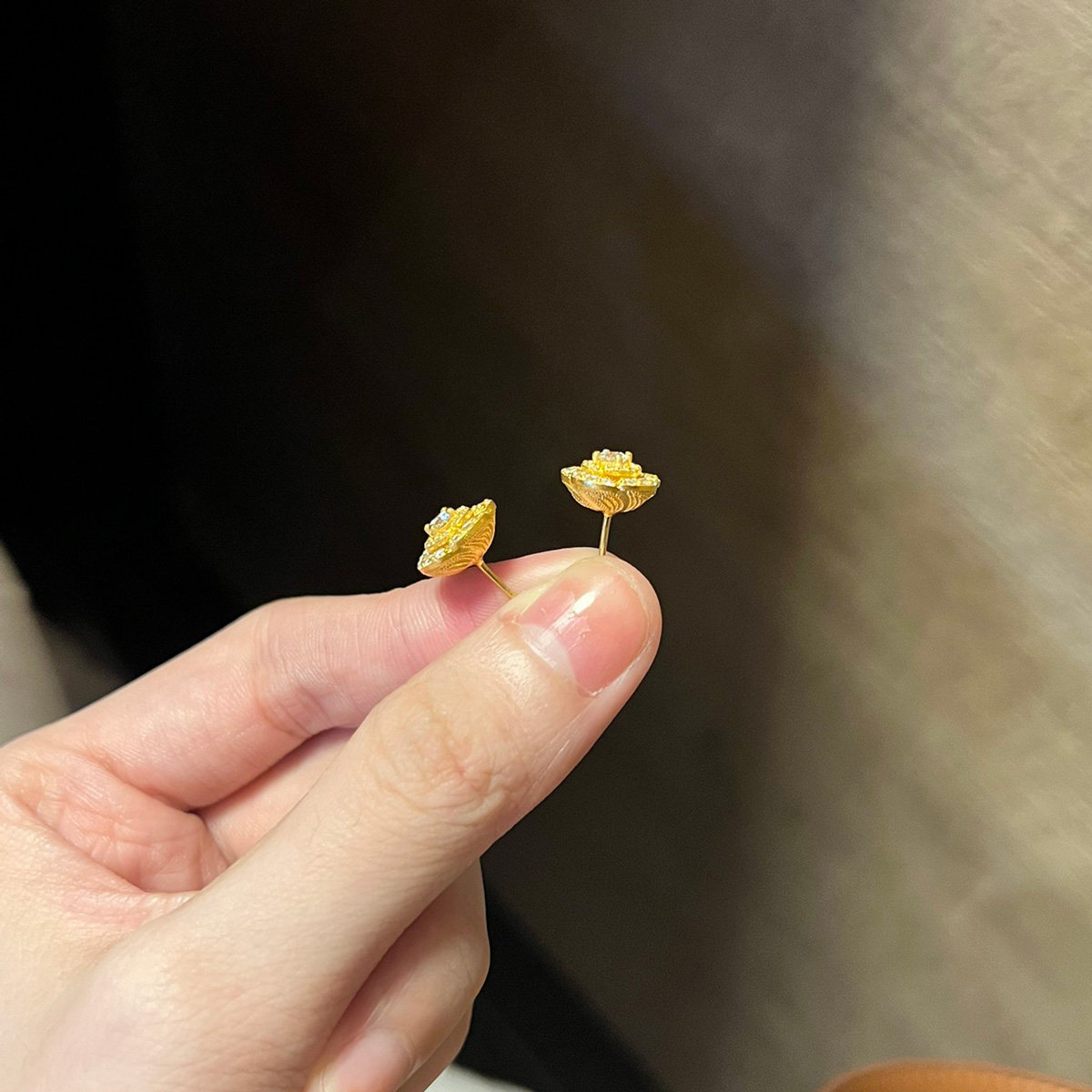 吉盟珠宝古法黄金耳钉女款999足金点钻耳饰玫瑰花闪亮时尚大气