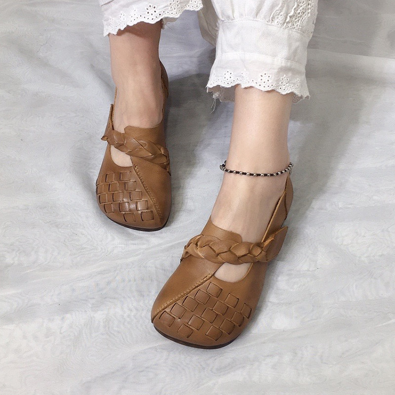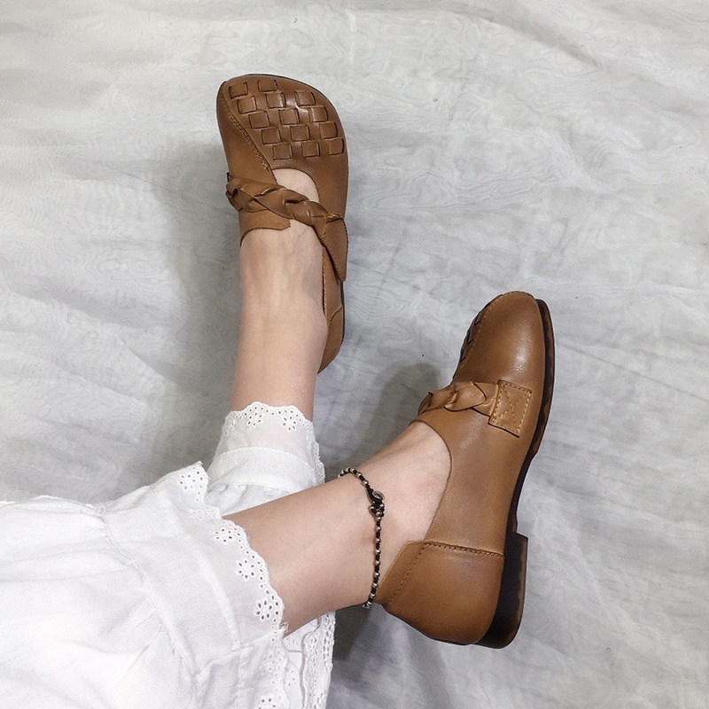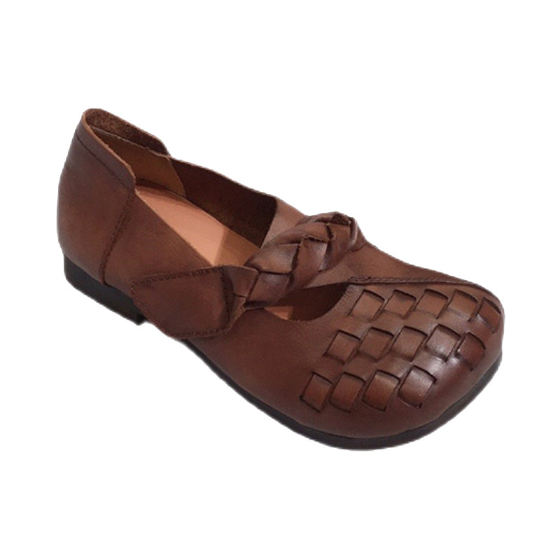 艺鞜复古编织真皮手工女鞋2026春季新款魔术贴大圆头软底浅口单鞋