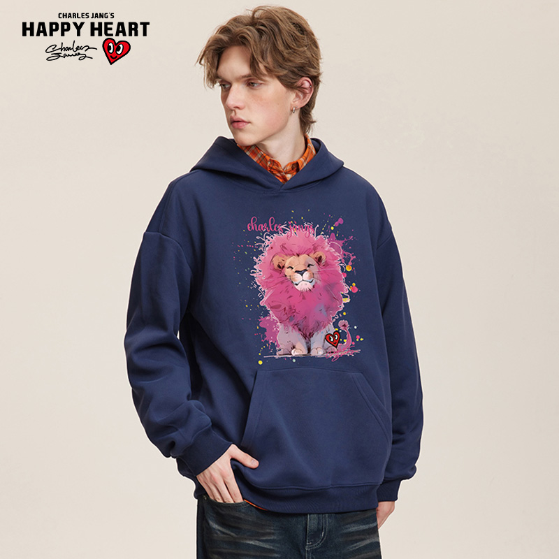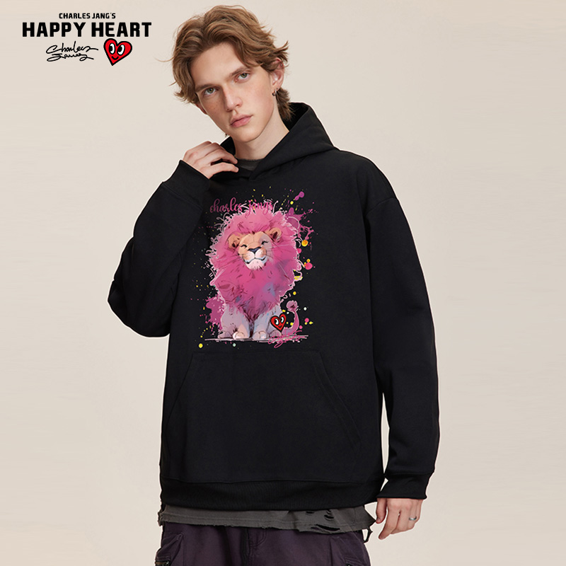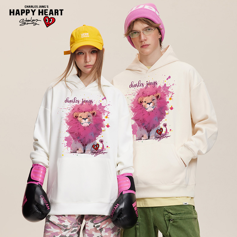 查尔斯桃心 粉色小狮子童趣印花美式连帽卫衣男女春秋季休闲外套