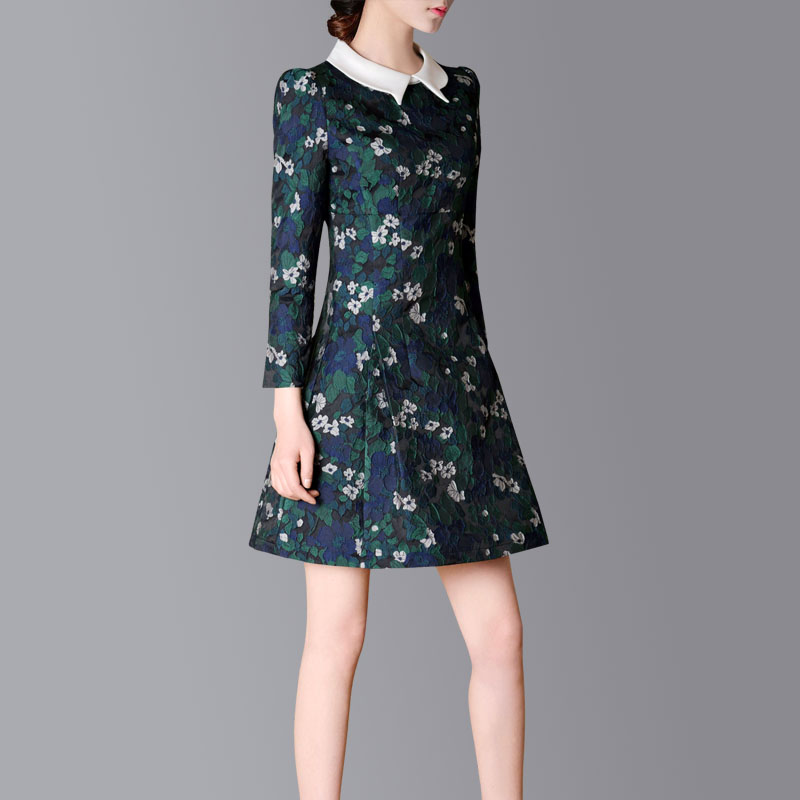 尘埃之家2025春装新品七分袖修身提花碎花拼接大摆连衣裙女A36
