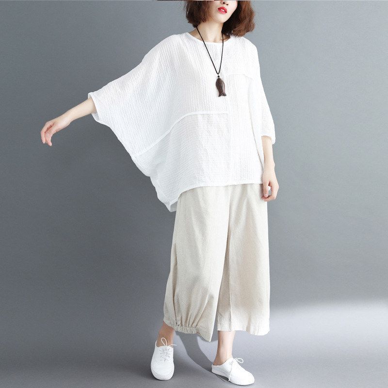 上衣夏季棉麻潮休闲纯裤MM胖色拼接宽松白色大码女装蝙蝠衫