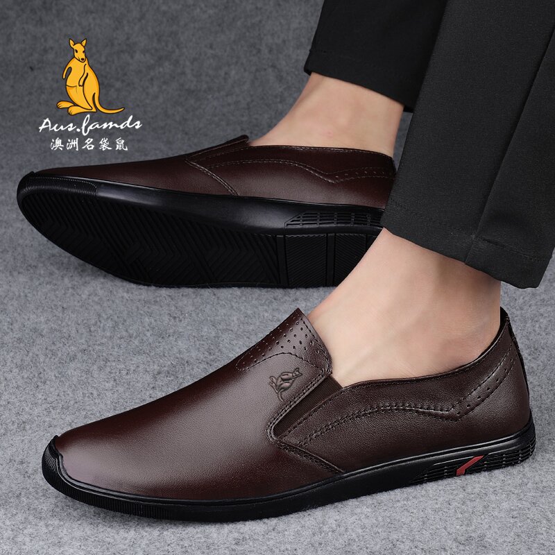 澳洲名袋鼠男鞋秋季新款真皮爸爸防滑轻便男士一脚蹬商务休闲皮鞋