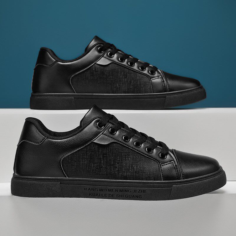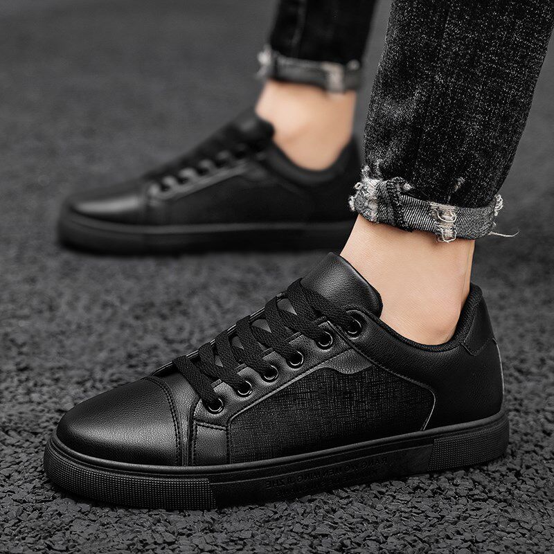 男鞋纯黑色板鞋韩版潮流休闲皮鞋百搭全黑色英伦鞋黑底工作上班鞋