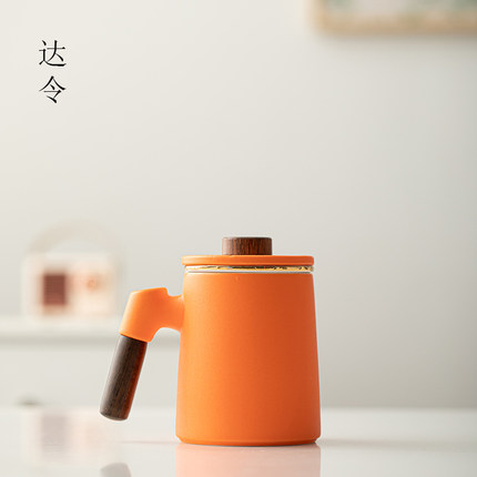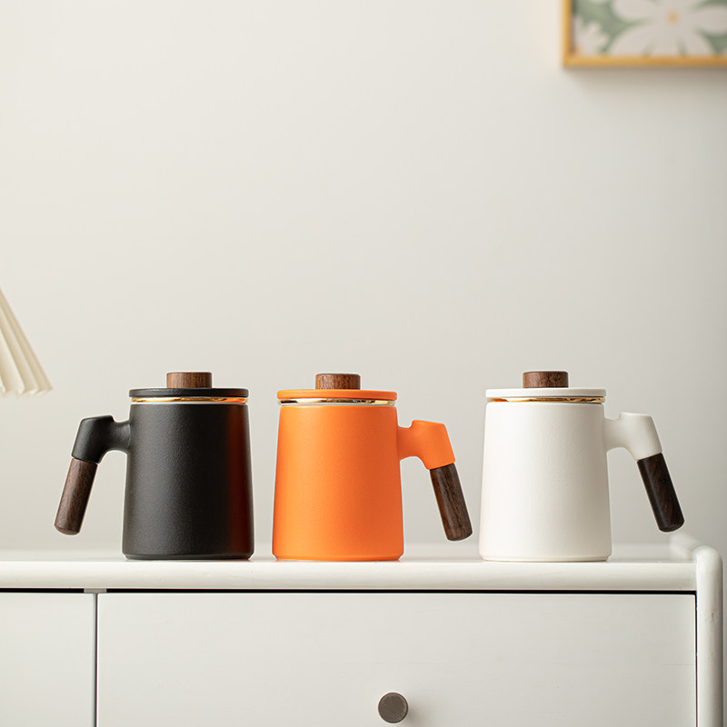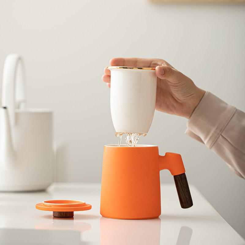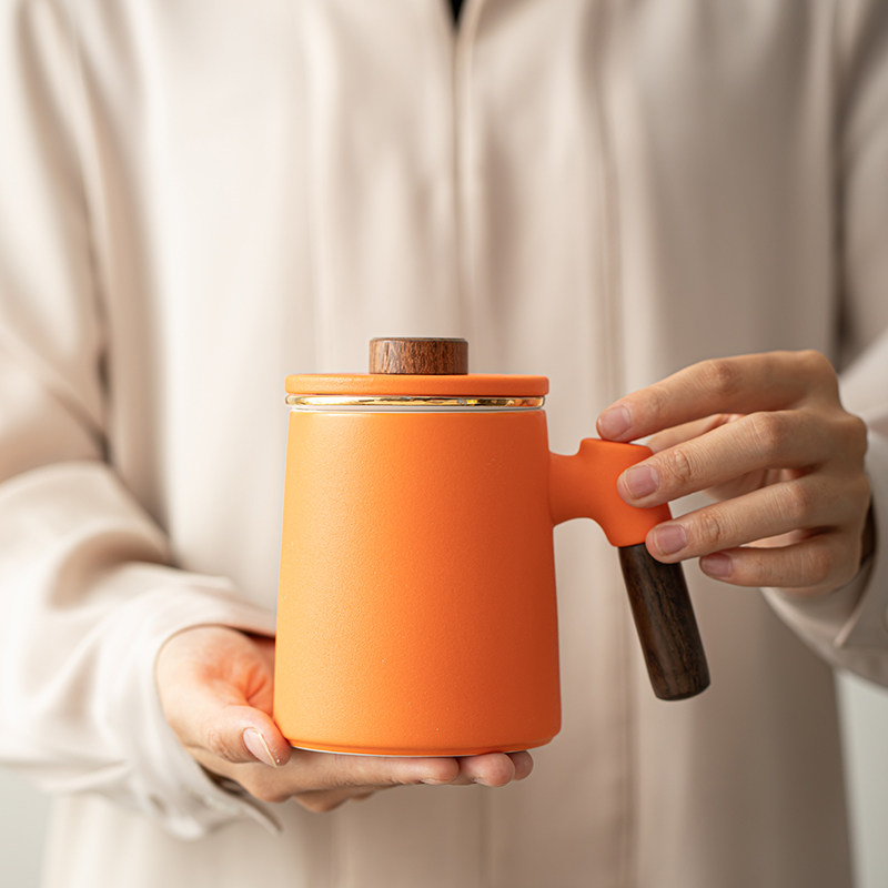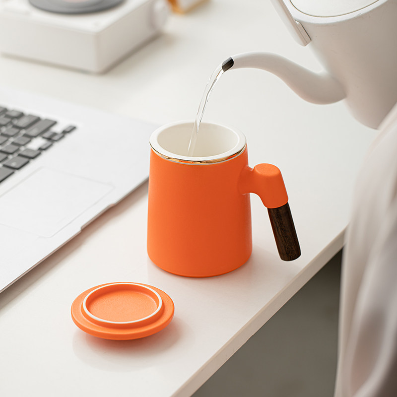 马克杯带盖简约陶瓷茶杯茶水分离办公杯橙色水杯咖啡杯礼物可定制