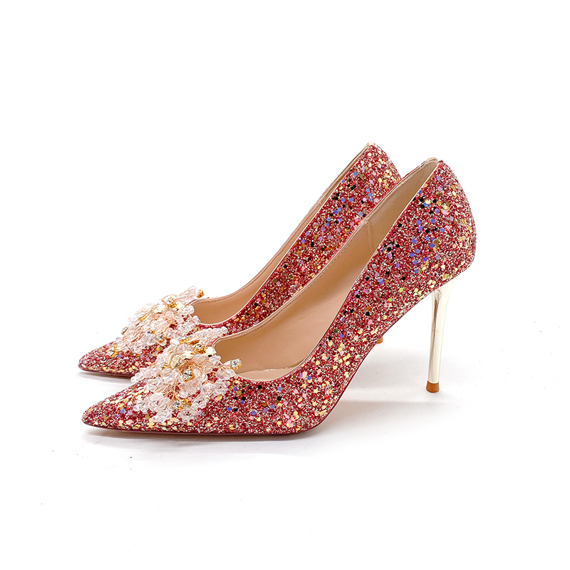 婚鞋秀禾主婚纱两穿新娘鞋新款法式酒红色水晶高跟鞋不累脚高级感
