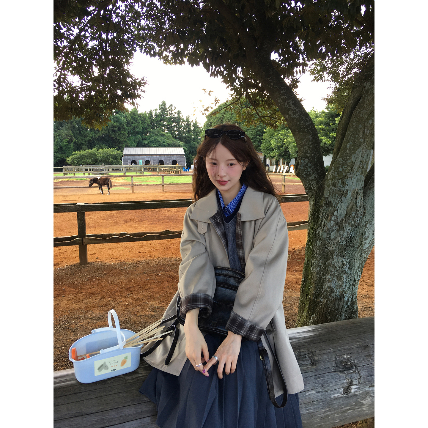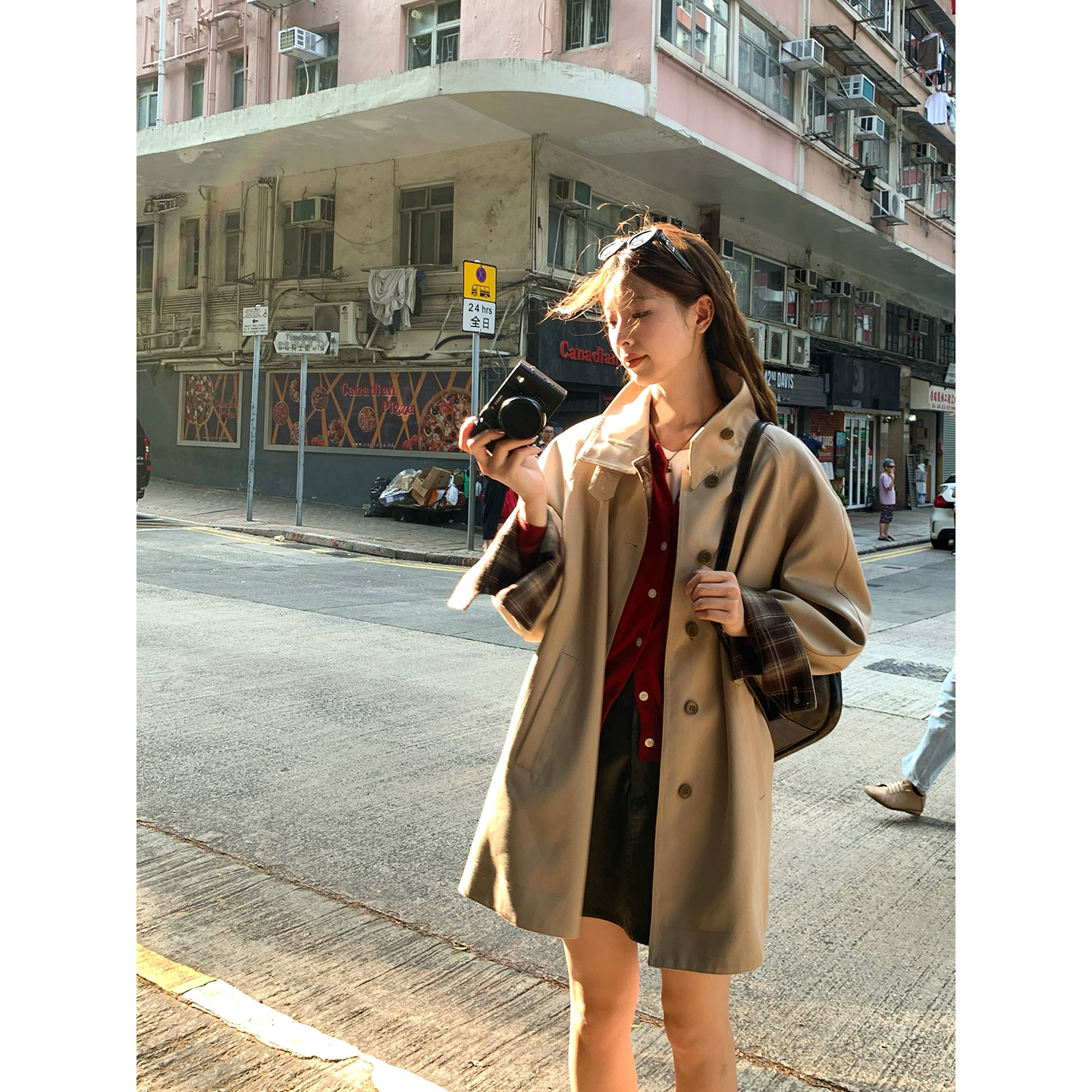 WHYSTUDIO 两面穿卡其格子中长款风衣女秋季新款翻领立领宽松外套