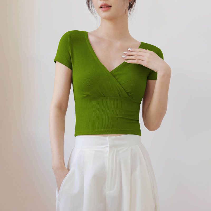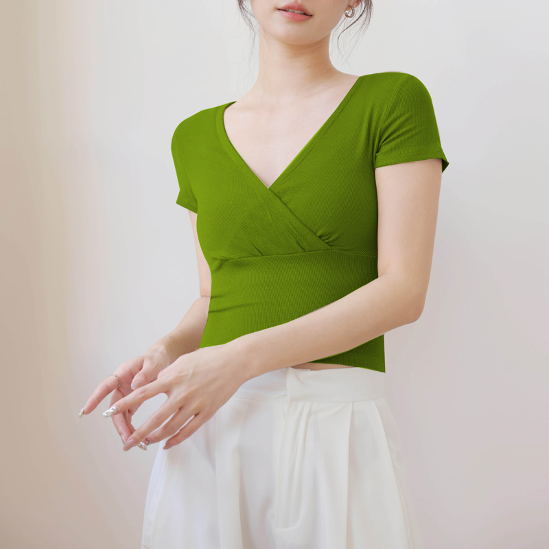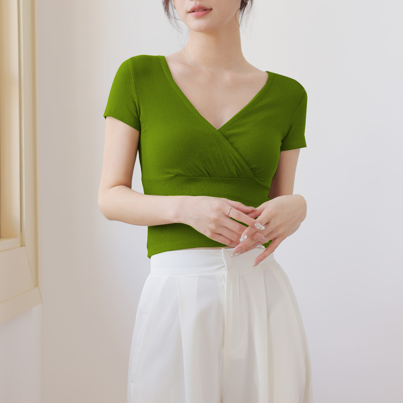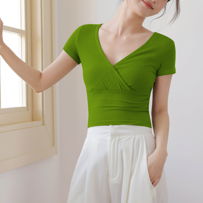 牛油果绿短袖t恤女低领纯棉打底衫瑜伽舞蹈服修身V领短款露脐上衣