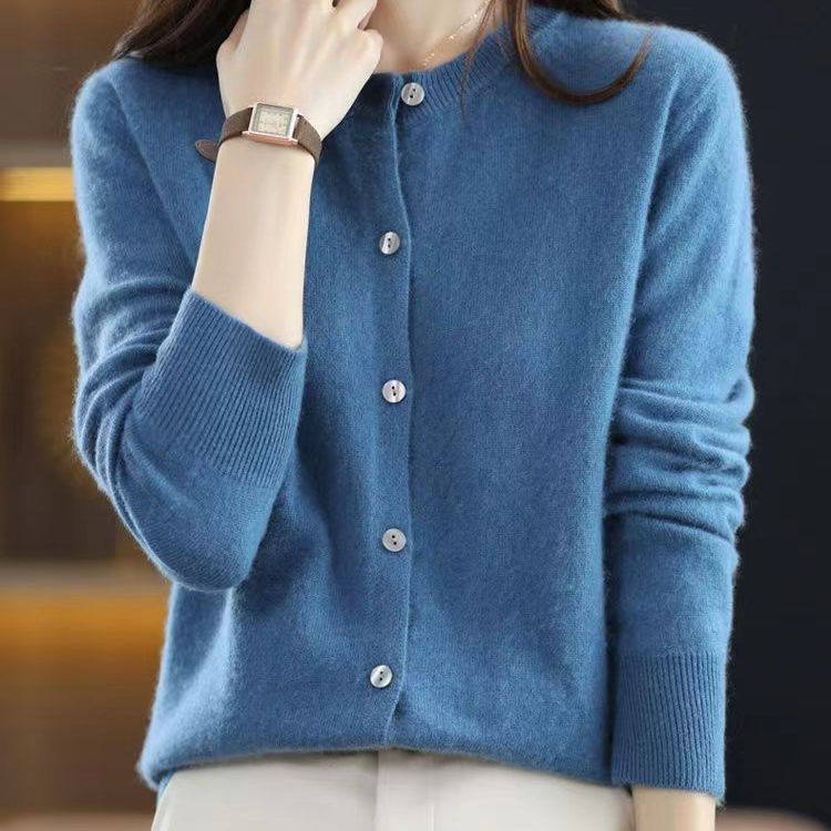 100%纯羊毛开衫女圆领春秋款针织羊毛衫打底薄毛衣宽松小开衫外套