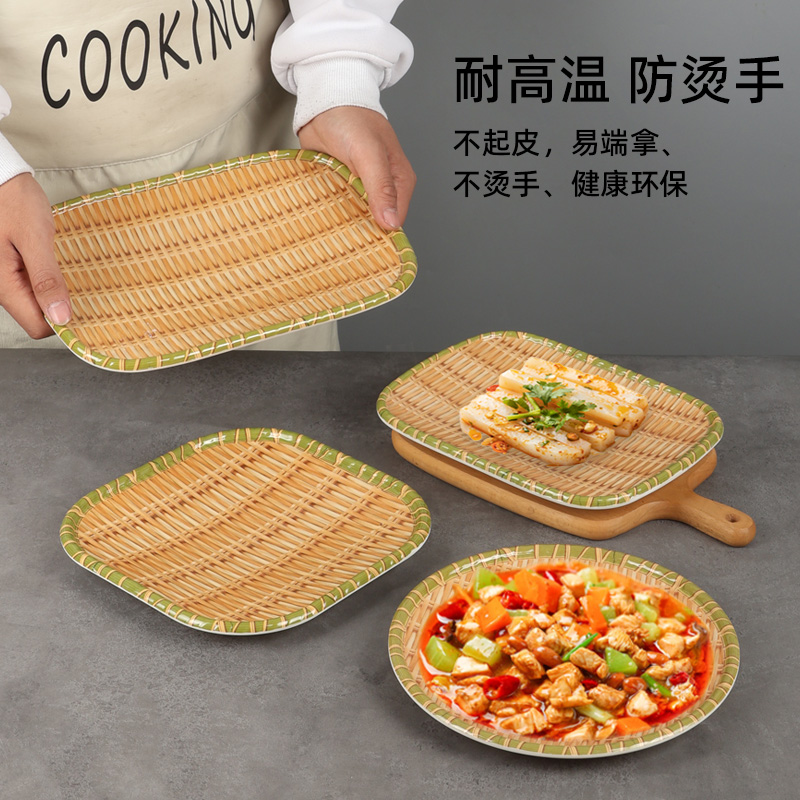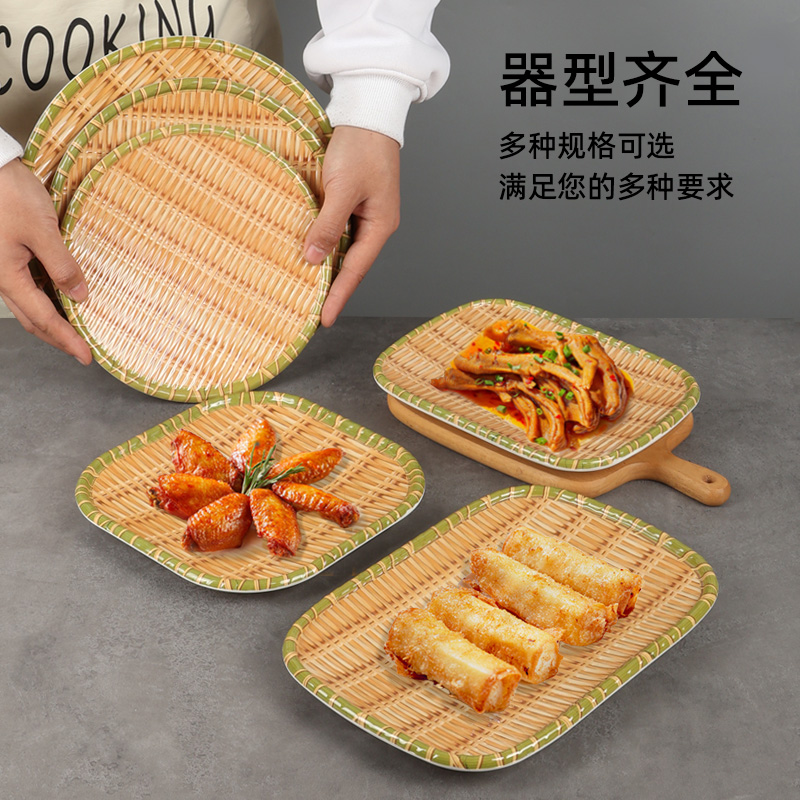 仿竹编烧烤店密胺仿竹编织火锅盘塑料仿簸箕干果盘油炸食品零食盘