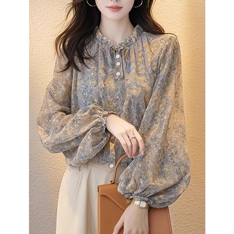 法式雪纺上衣女秋季2024年新款爆款洋派独特别致超好看荷叶边衬衫
