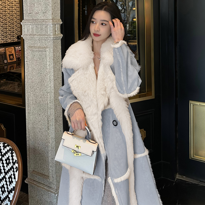 马克华菲女装精致大牌奢华仿皮毛外套名媛风酷飒长款保暖拼接大衣