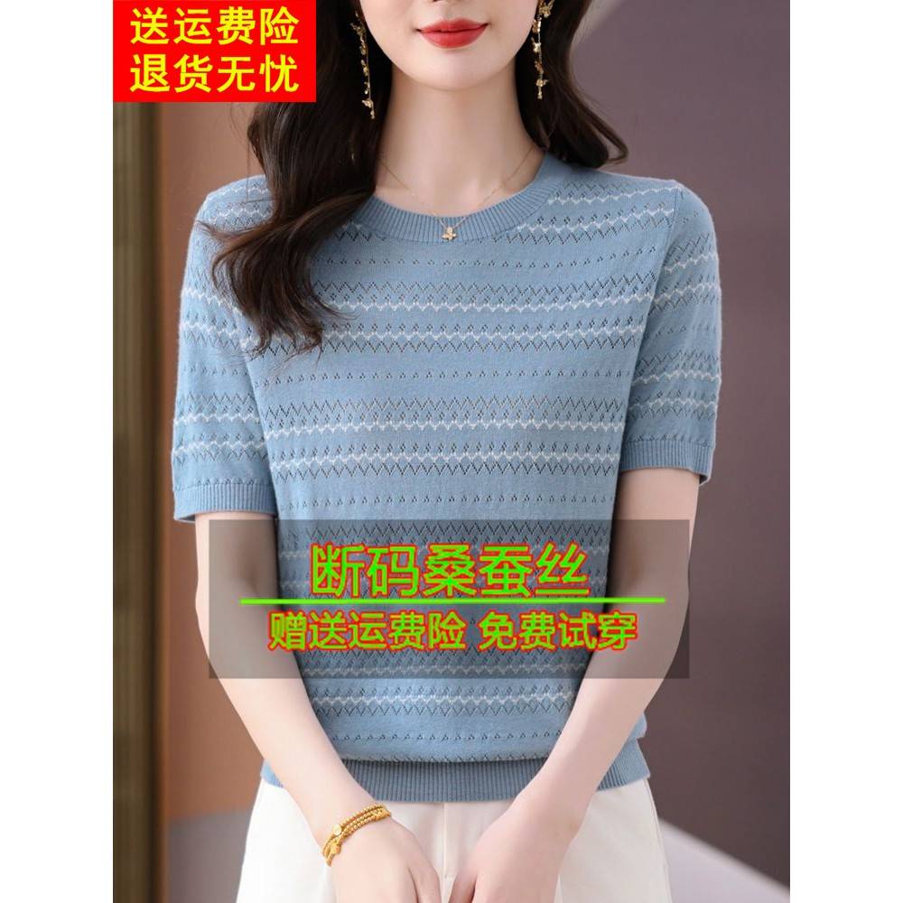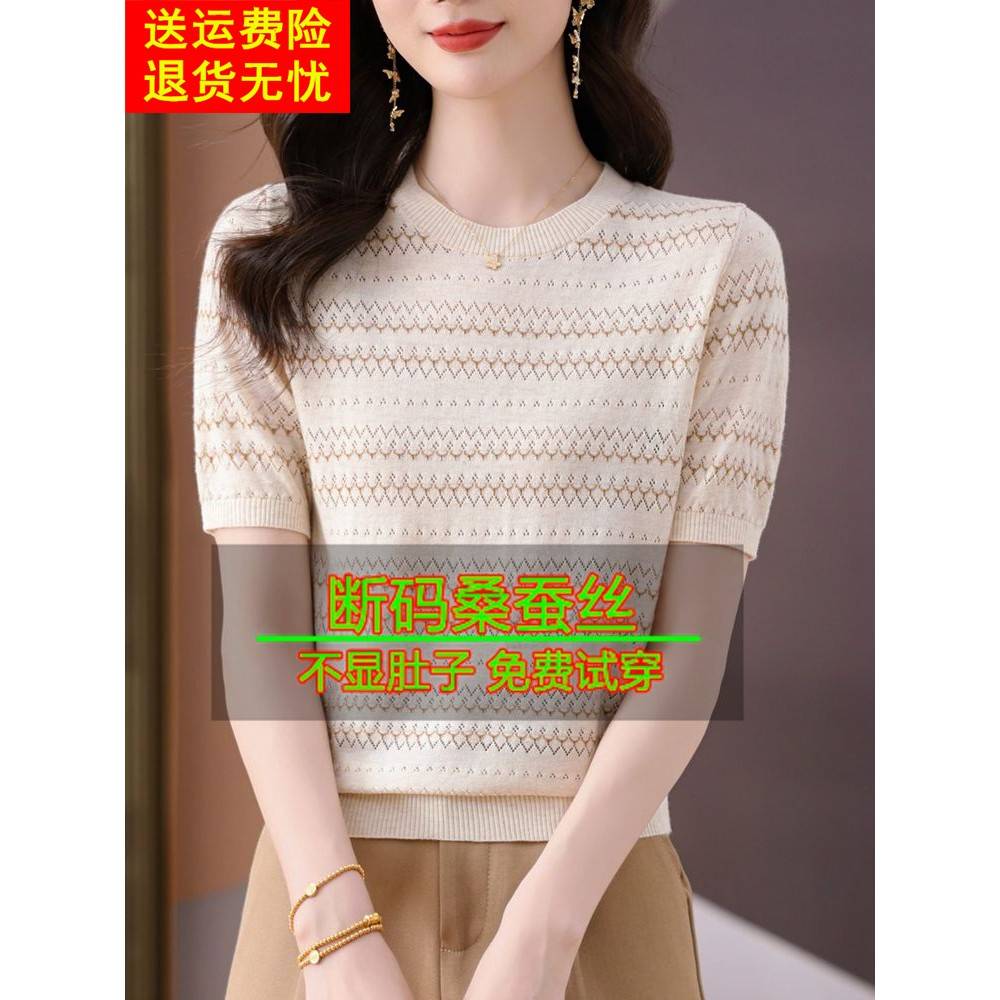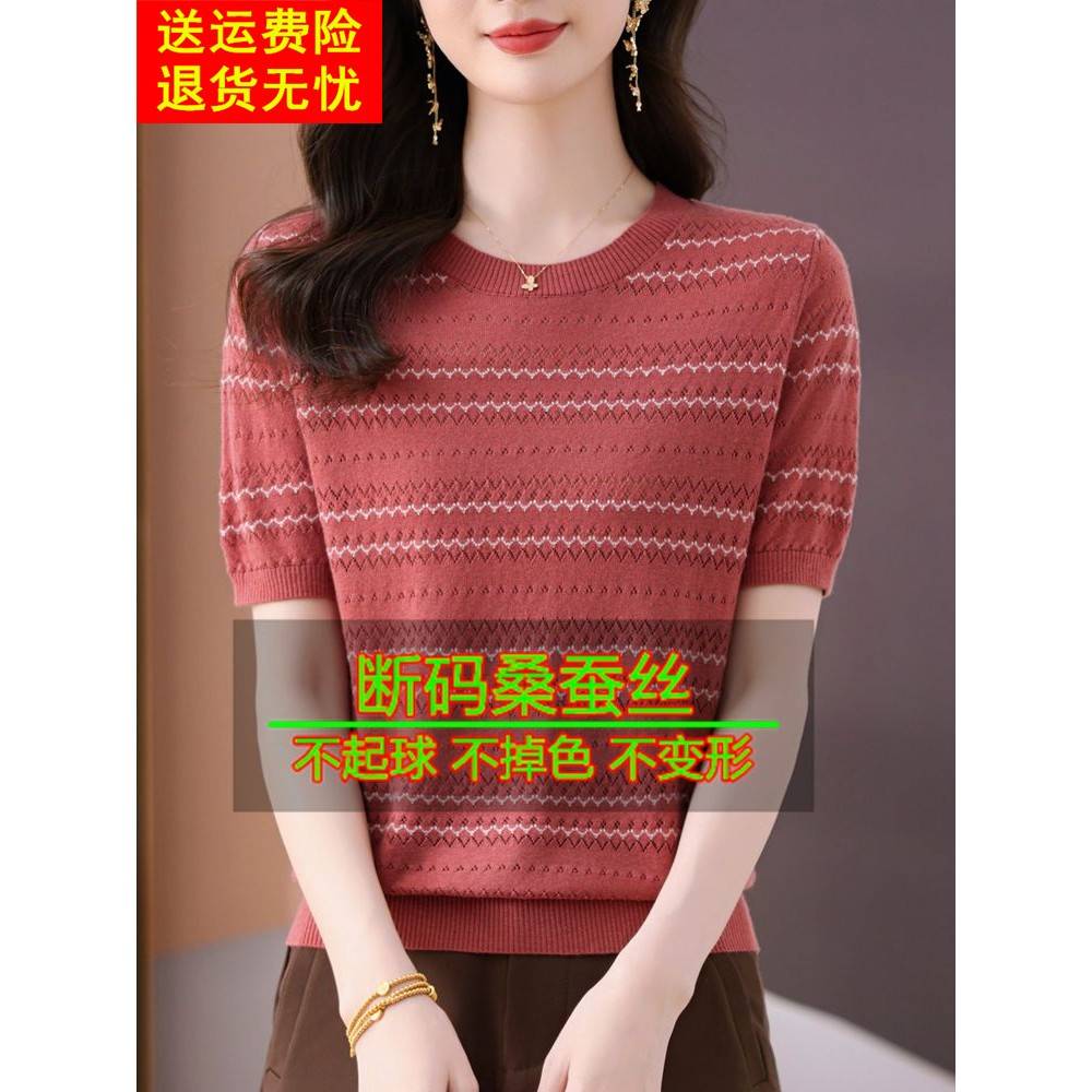 桑蚕丝短袖t恤女夏季薄款条纹针织天丝小衫妈妈洋气宽松显瘦上衣