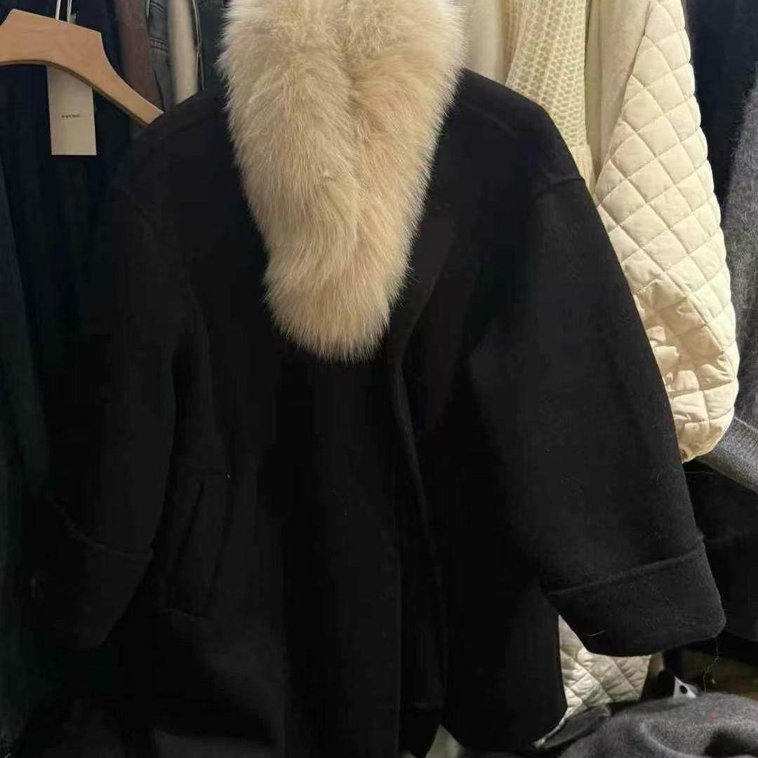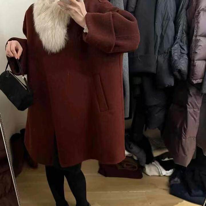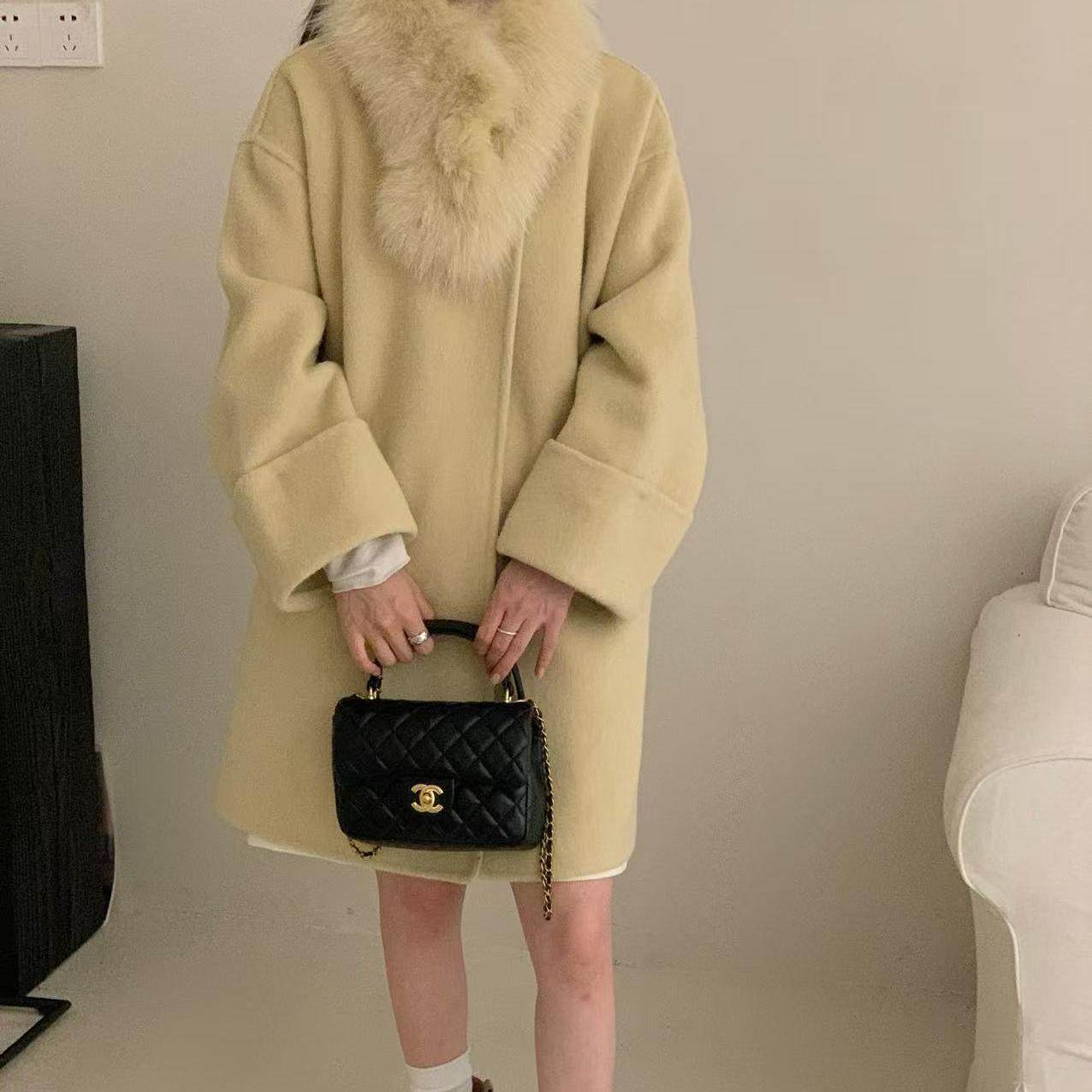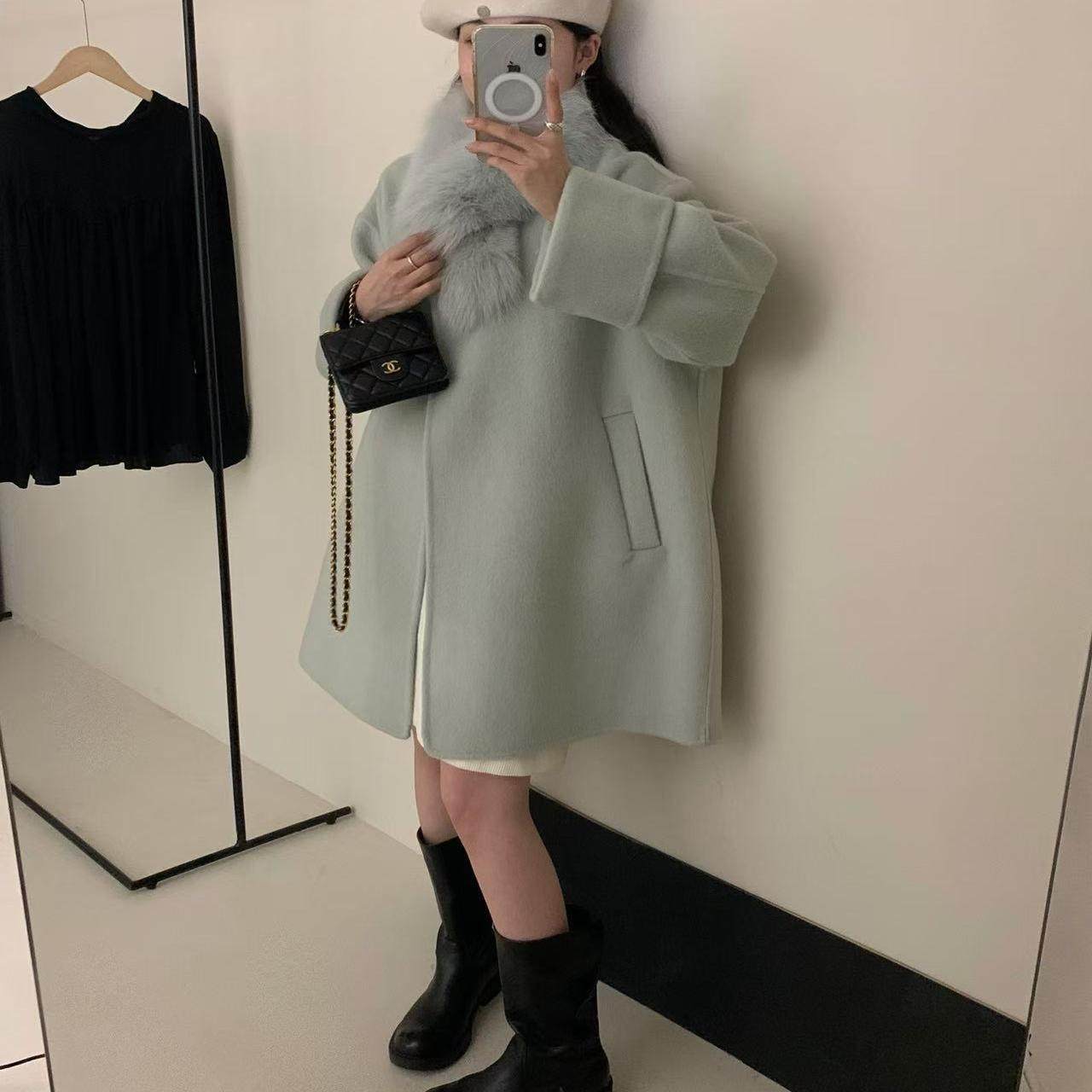 中长款狐狸毛领双面羊绒大衣莫兰迪色系香芋紫毛呢外套双面羊毛