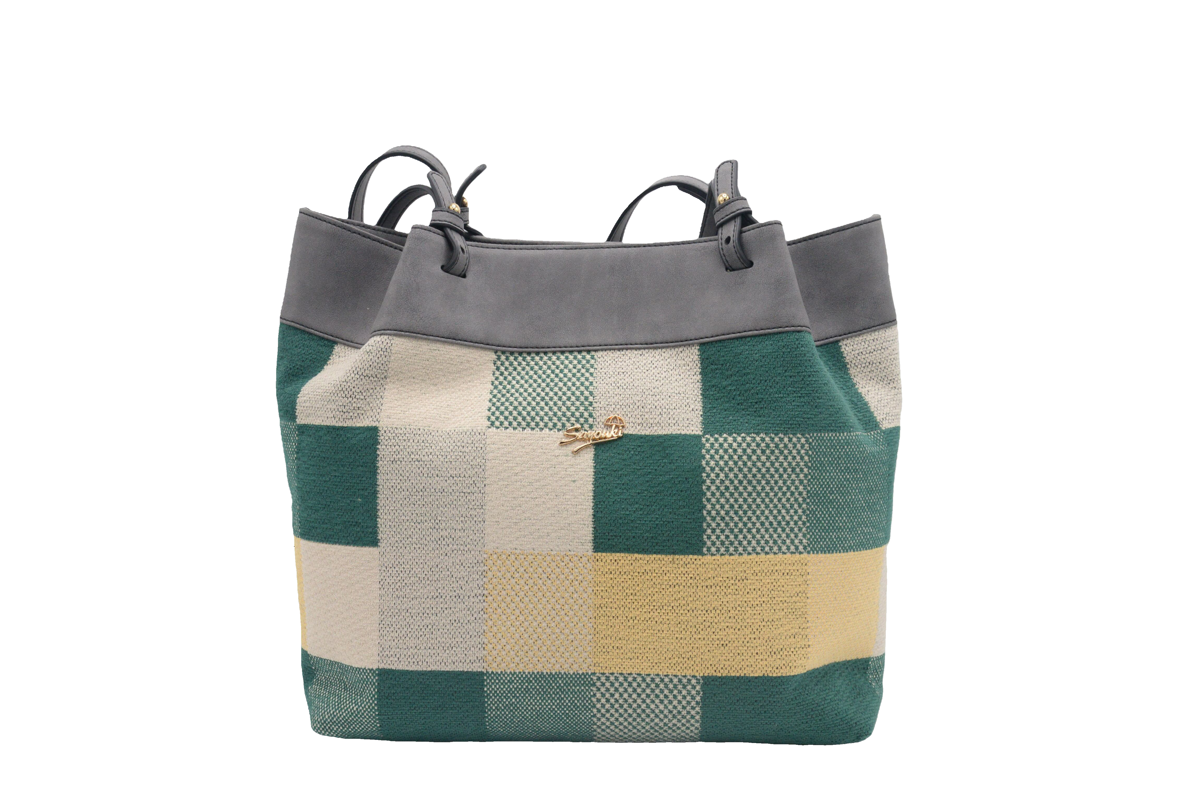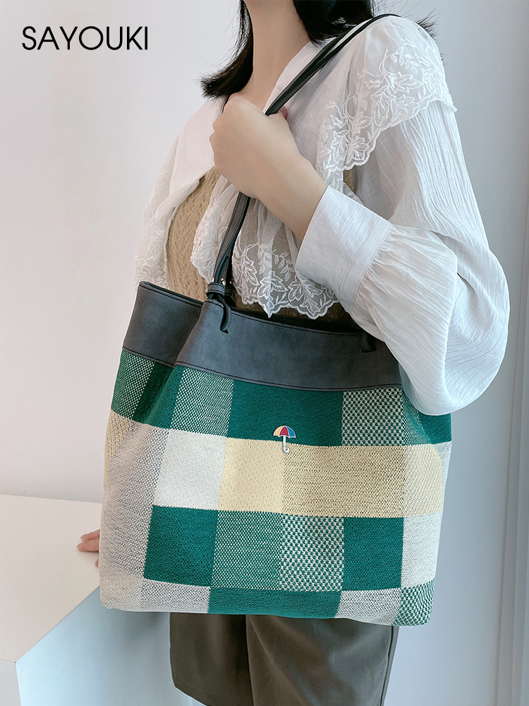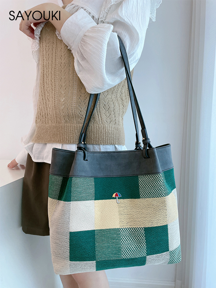 2024新款百搭格纹水桶包女潮流单肩背包Sayouki小众设计大容量