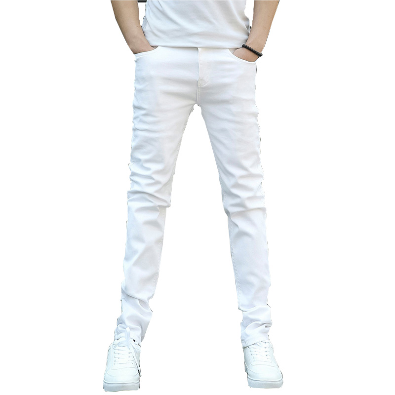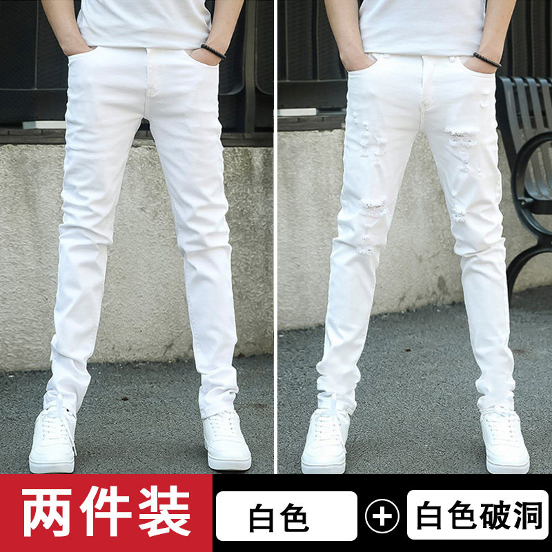 天蓝色纯白裤子男冬弹力白色长裤破洞加绒牛仔裤男韩版修身小脚裤