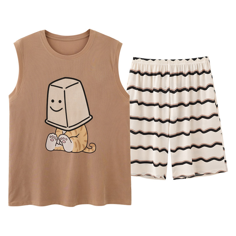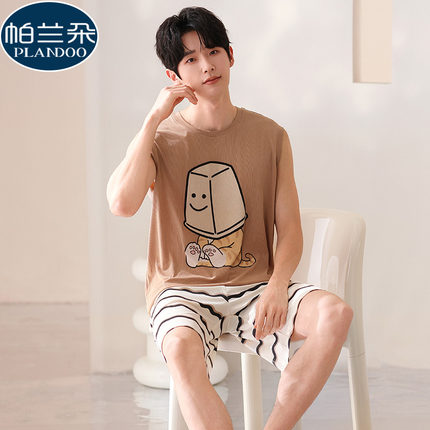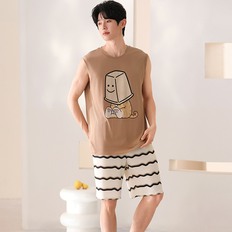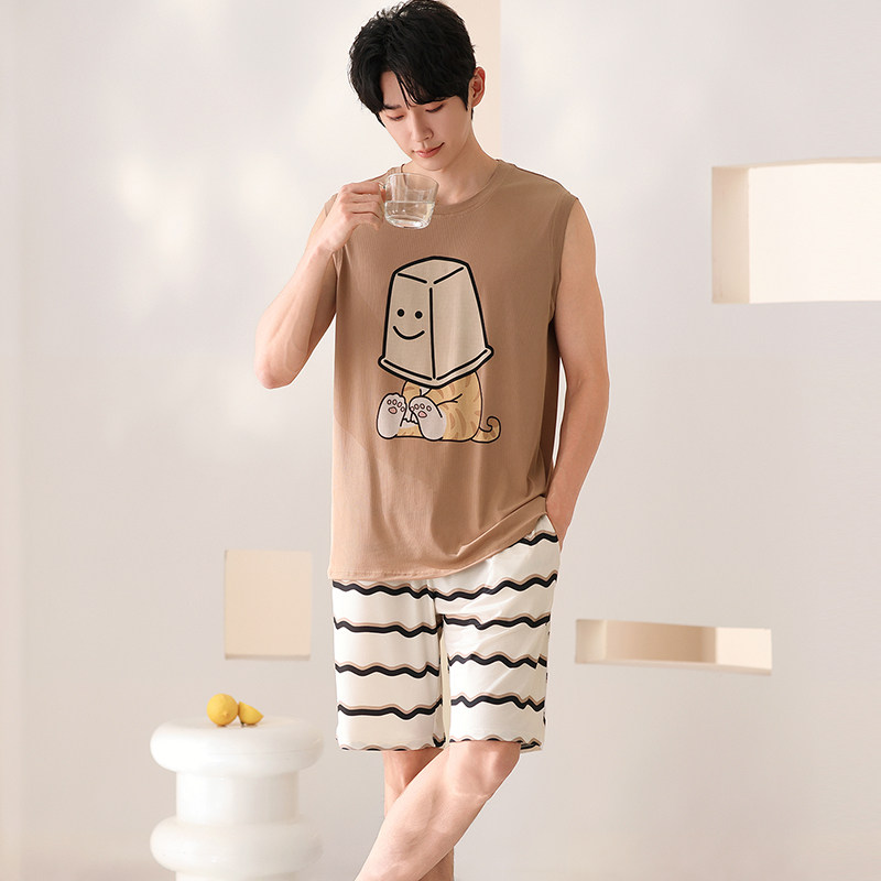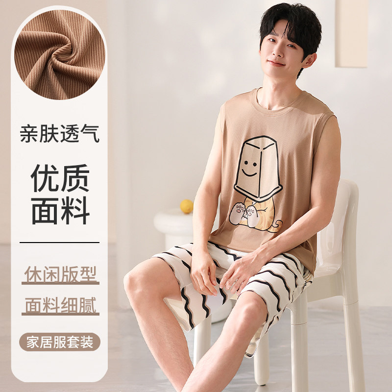 男士背心睡衣夏季冰丝无袖短裤套装薄款休闲卡通男生家居服可外穿