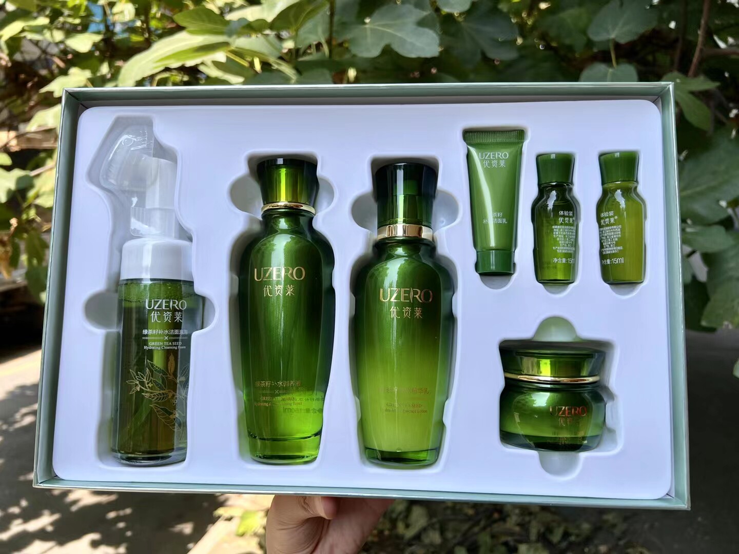 优资莱正品 绿茶籽补水九件套礼盒 洁面水乳眼霜BB霜保湿霜气垫CC
