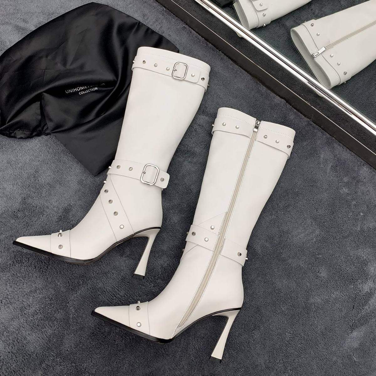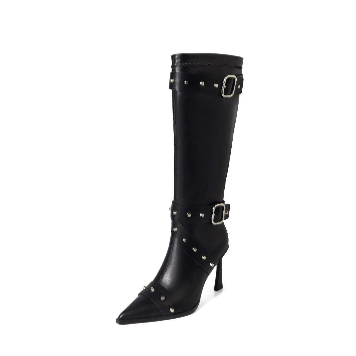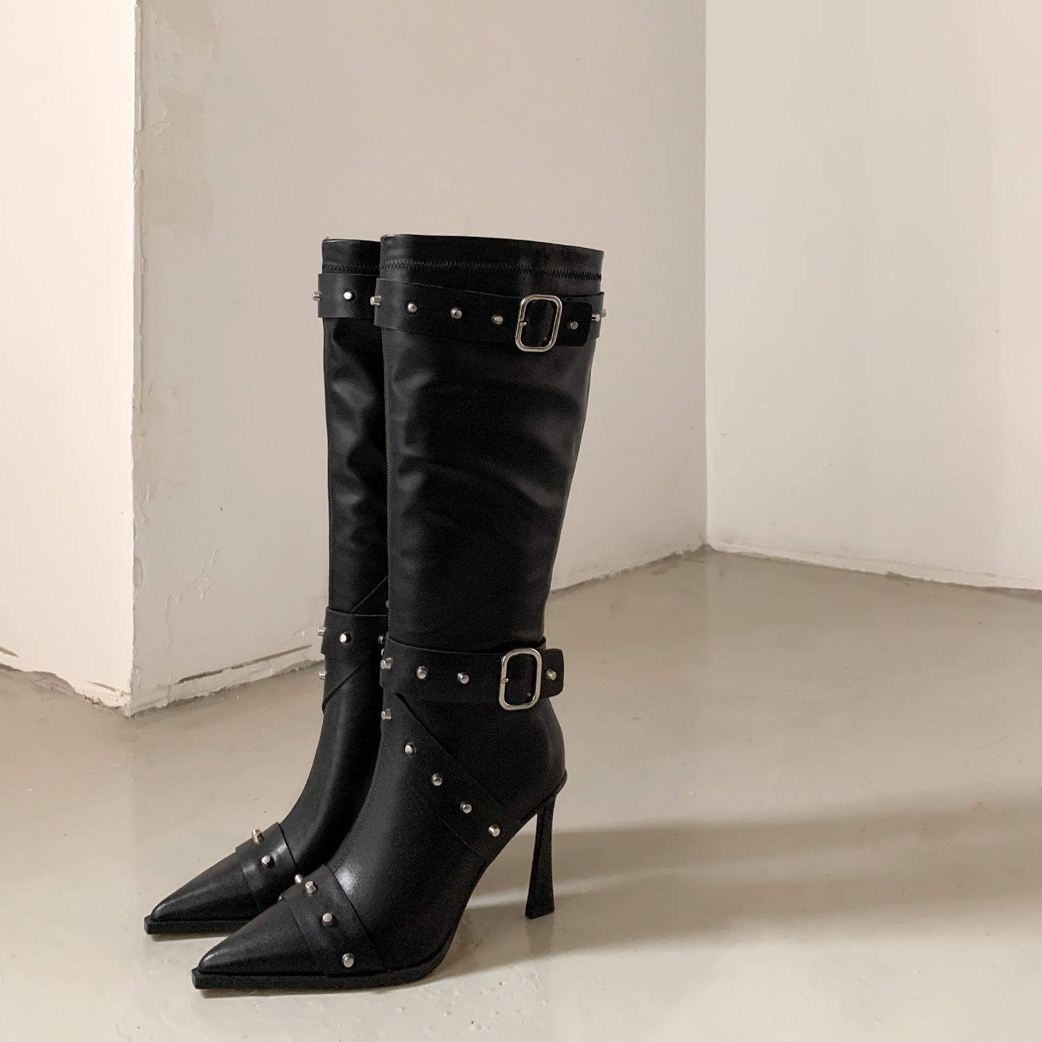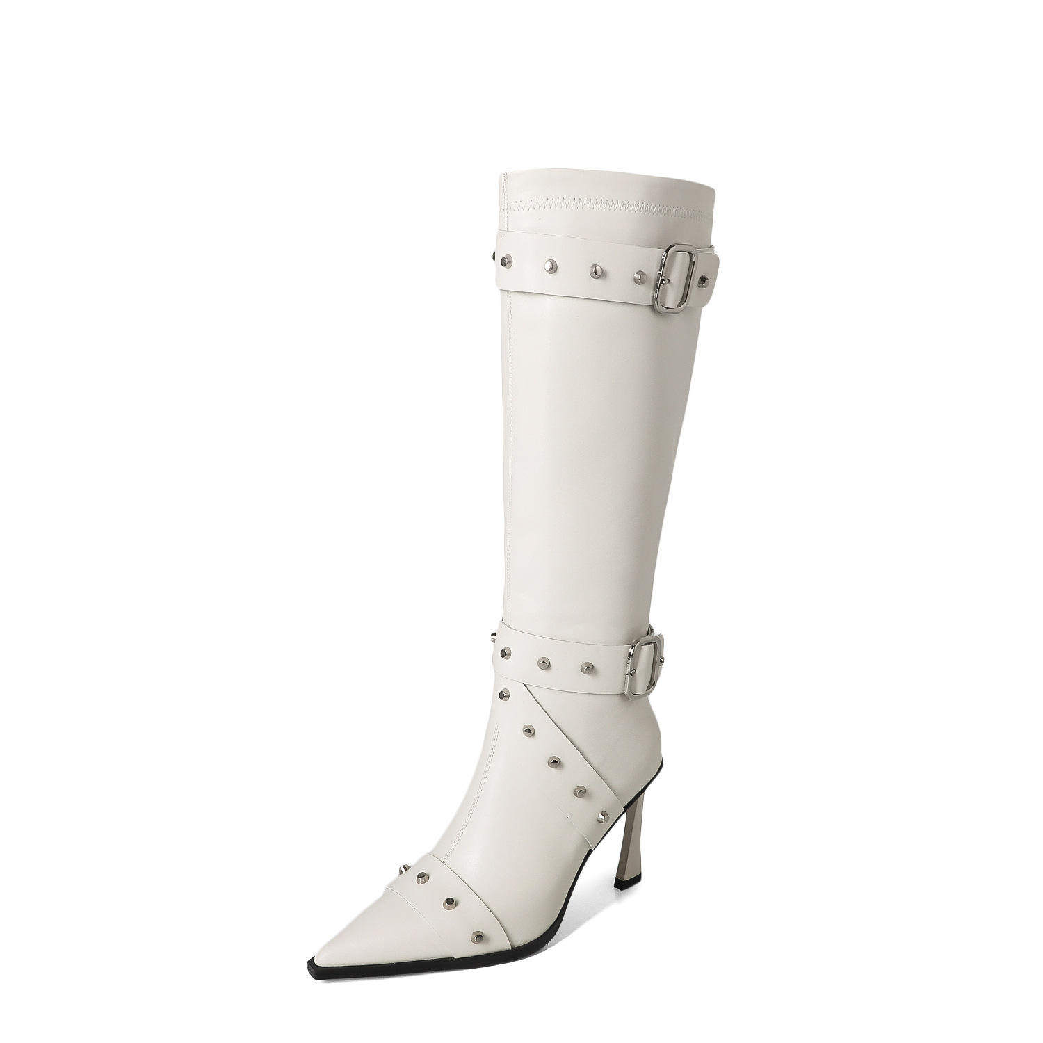 外贸铆钉皮带扣高筒靴女鞋尖头细跟欧美高跟甜酷风长靴子时装靴