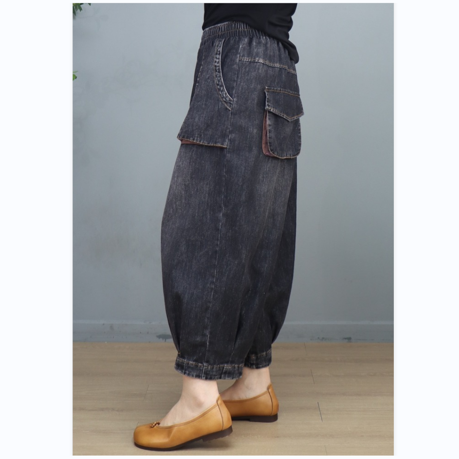 超薄款春夏立体口袋牛仔灯笼裤女复古休闲宽松九分松紧腰阔腿裤子