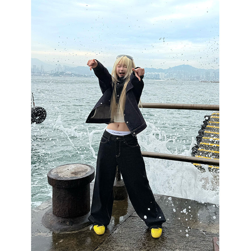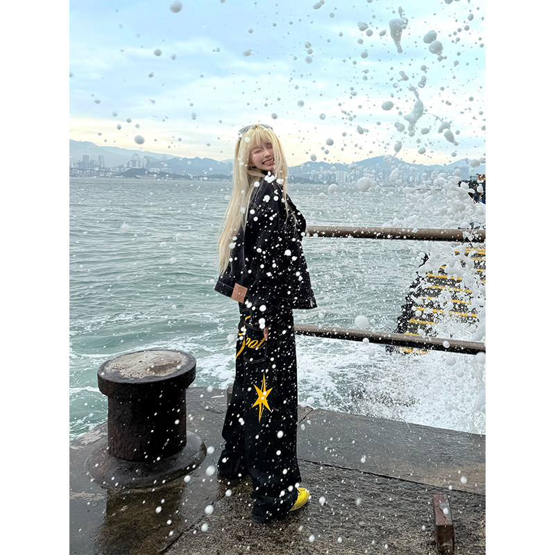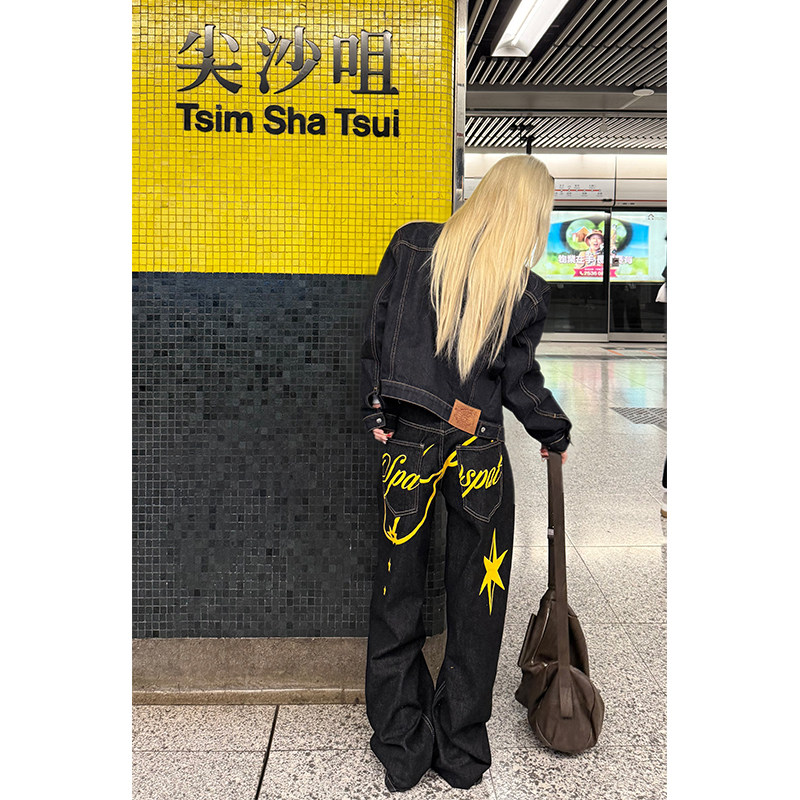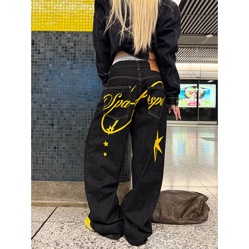 JMJ美式复古水洗字母印花牛仔裤男女宽松休闲百搭直筒阔腿长裤