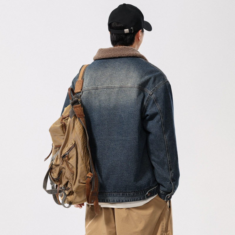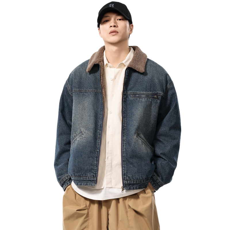 复古美拉德翻领羊羔绒加绒牛仔外套男冬季大码摇粒绒工装夹克冬款