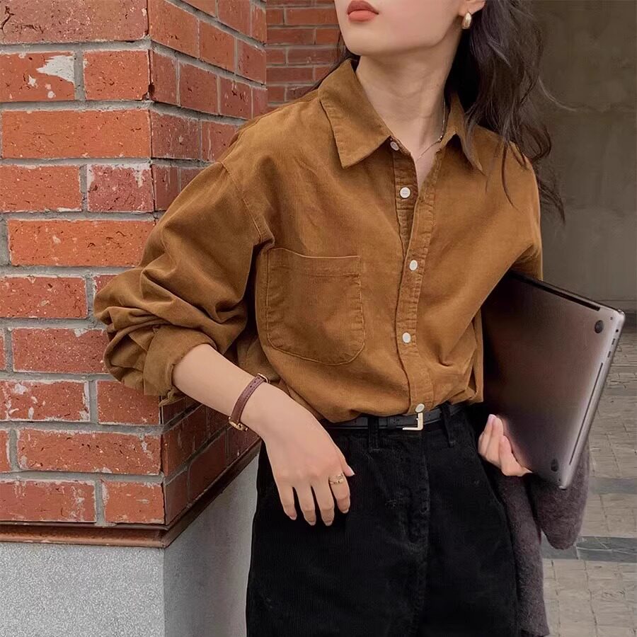 港风氛围感通勤穿搭长袖磨毛衬衫女秋冬新款小众打底加厚翻领上衣