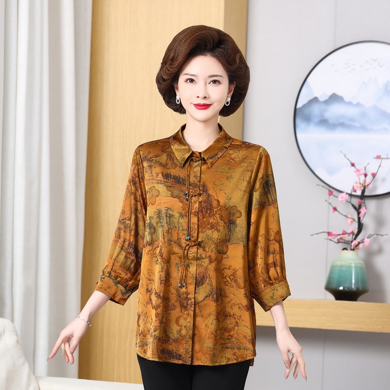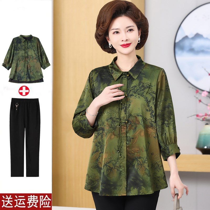 妈妈春秋装衬衫洋气上衣新款中老年女夏装七分袖t恤小衫两件套装