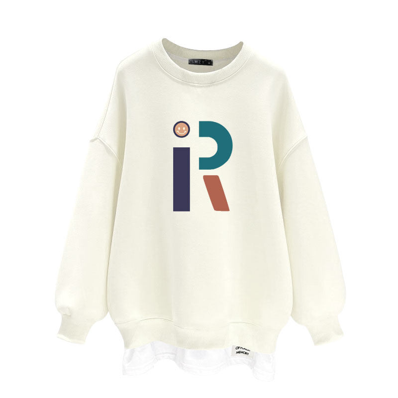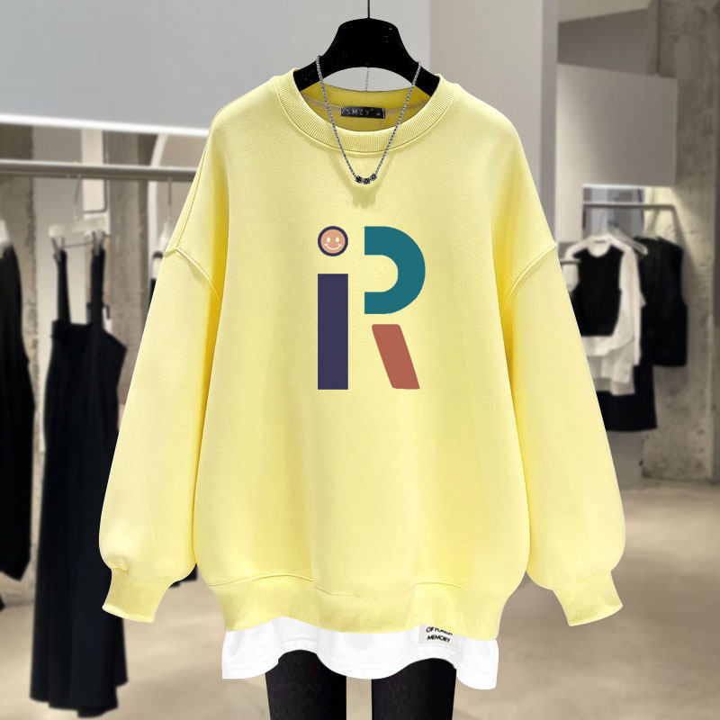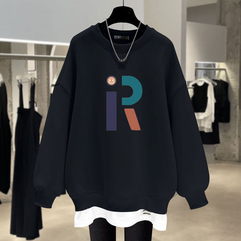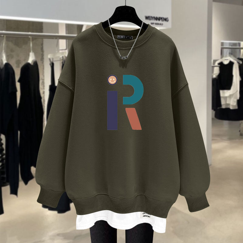 撞色字母圆领卫衣女2025春秋冬宽松加绒加厚假两件中长款遮屁股潮